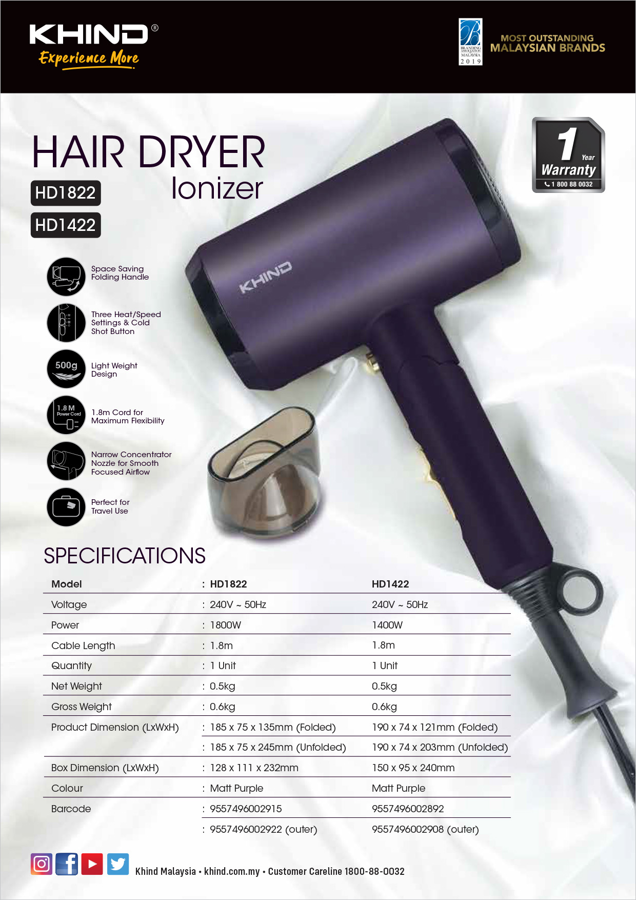 KHIND 1800W Ionizer Hair Dryer HD1822 | 3 Heat / Speed Settings & Cold Shot Button | Narrow Concentrator Nozzle for Smooth Focused Airflow | Space Saving Folding Handle | Hair Dryer with 1 Year Warranty