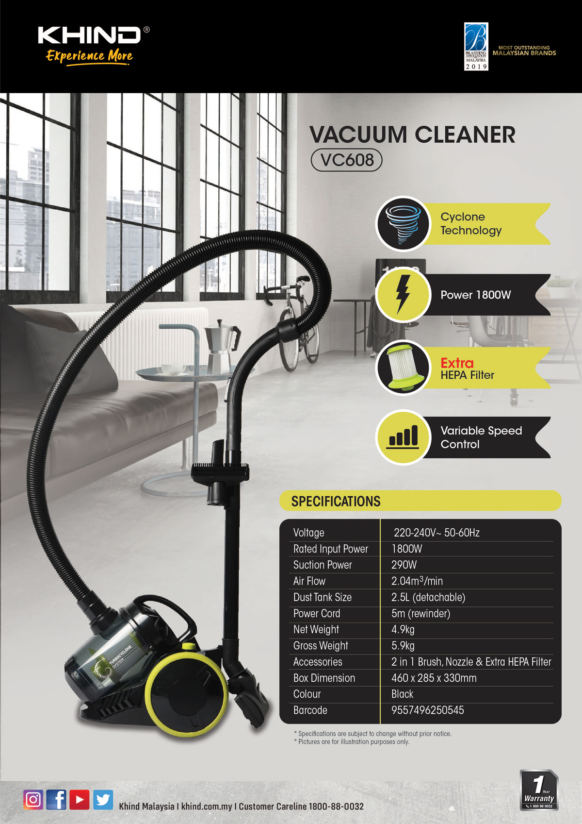 KHIND 1800W Vacuum Cleaner VC608 | Cyclone Techonlogy | Extra HEPA Filter | Cyclone Technology | Variable Speed Control | Vacuum Cleaner with 1 Year Warranty
