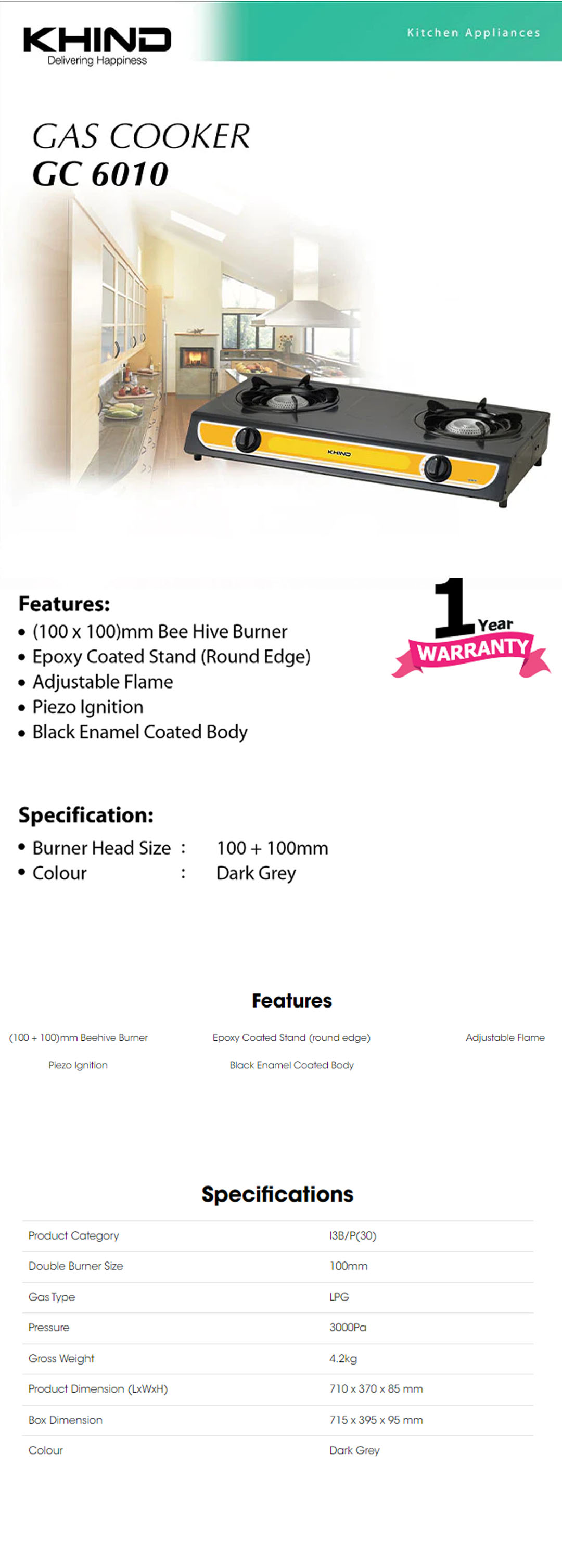 KHIND 2 Burners Gas Stove GC6010 | 100 x 100 Beehive Burner | Epoxy Coated Stand | ?Automatic Ignition | Adjustable Flame | Gas Stove with 1 Year Warranty