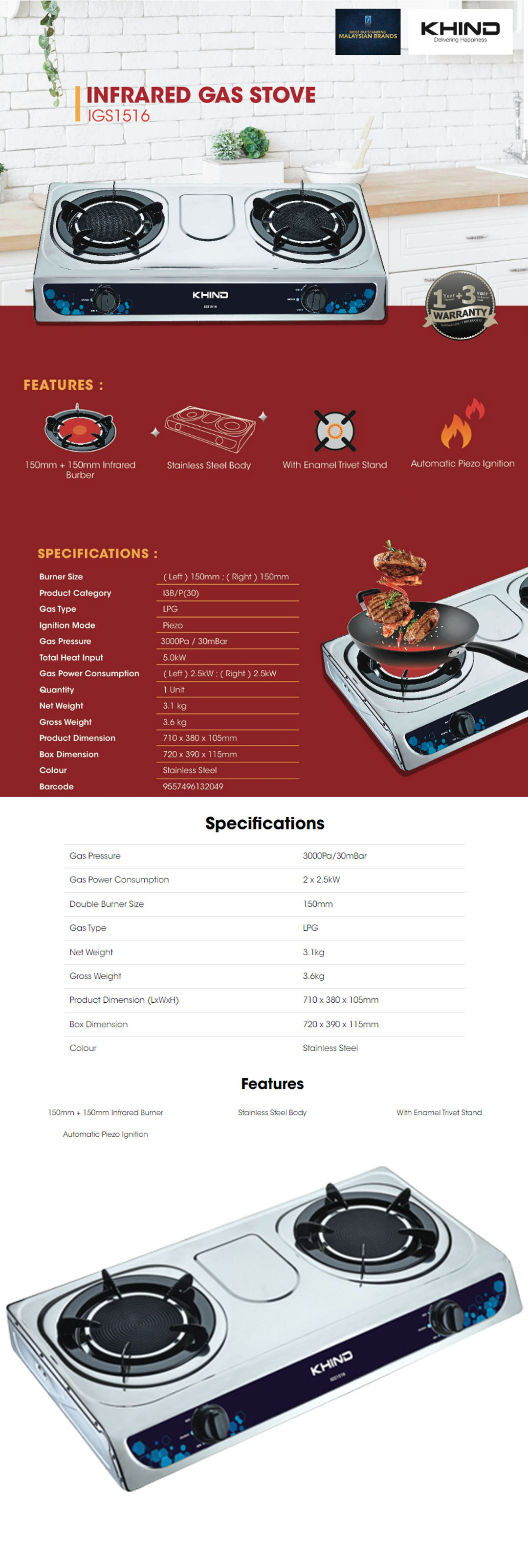 KHIND 2 Burners Infrared Gas Stove Stainless Steel IGS1516 | 150mm + 150mm Infrared Burner | With Enamel Trivet Stand | Automatic Piezo Ignition | Gas Stove with 1 Year General Warranty & 3 Years Burner Head Warranty