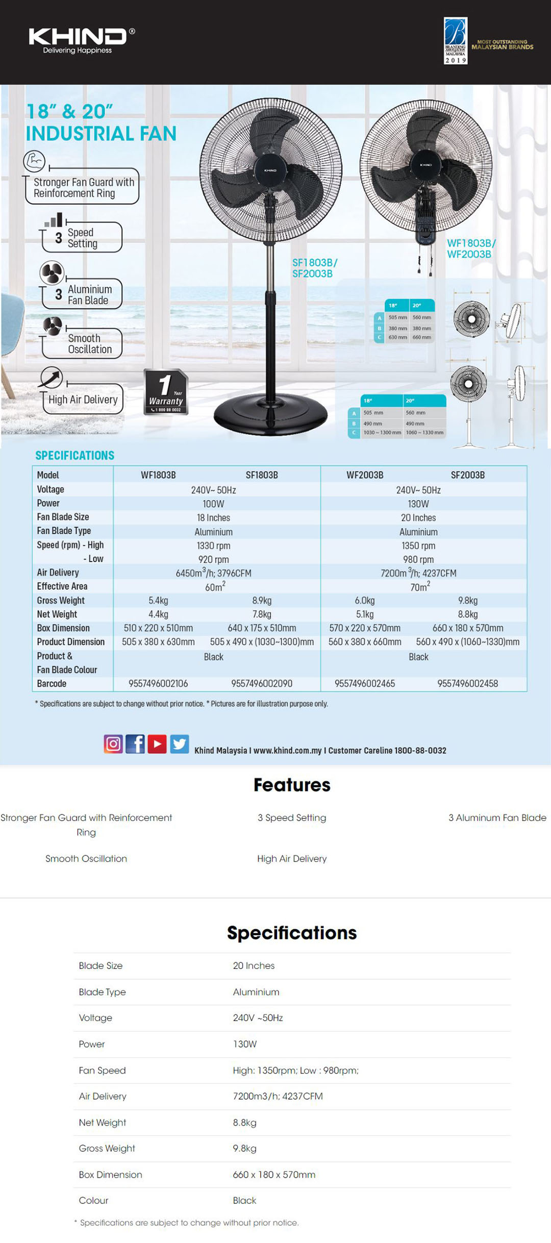 KHIND 20" Industrial Stand Fan SF2003B | 3 Speed Setting | 3 Aluminium Fan Blade | Smooth Oscillation | High Air Delivery | Stand Fan with 1 Year Warranty