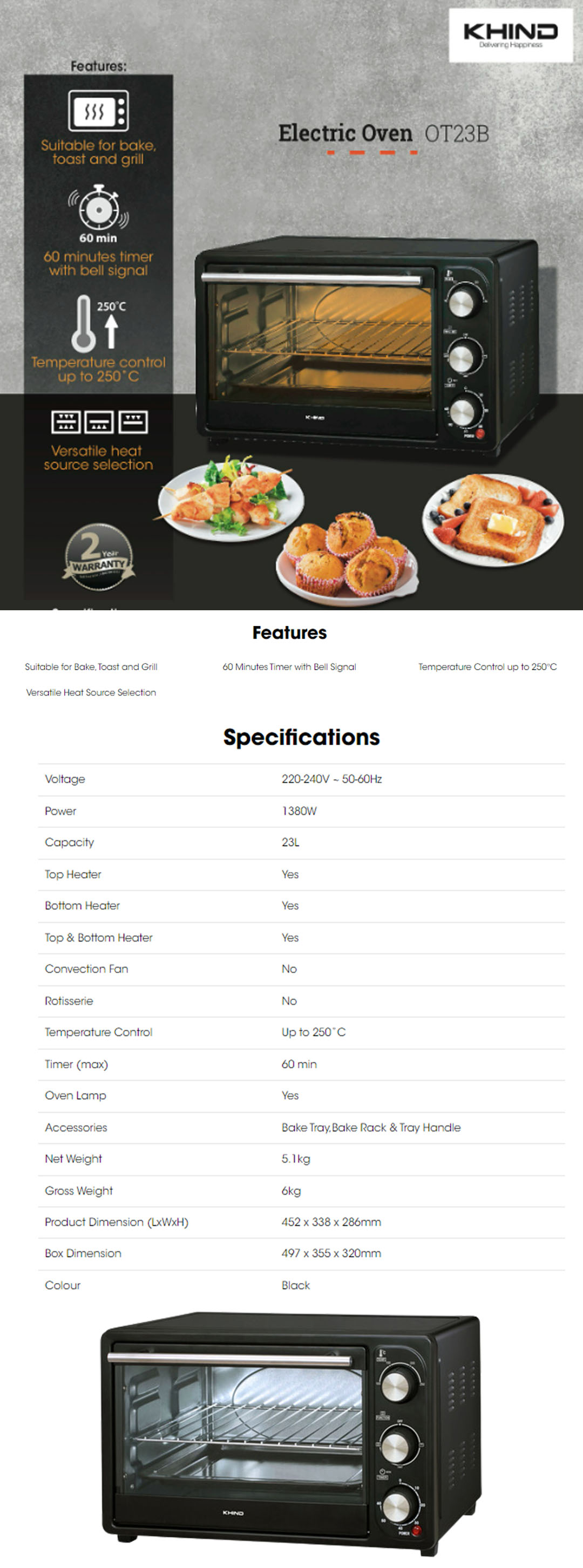 KHIND 23L Electric Oven OT23B | 60 Minutes Timer with Bell Signal | Versatile Heat Source Selection | Temperature Control | Oven with 2 Years Warranty