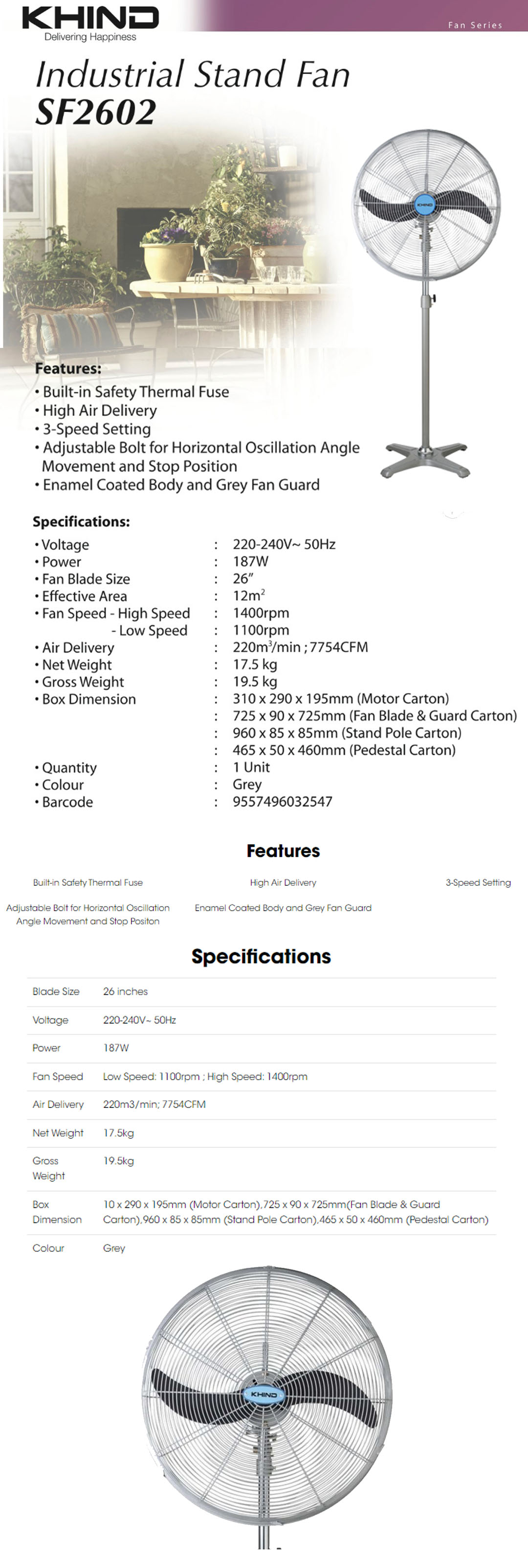 KHIND 26" Industrial Stand Fan SF2602 | Built-in Safety Thermal Fuse | 3-Speed Setting | High Air Delivery | Stand Fan with 1 Year General Warranty & 3 Years Motor Warranty