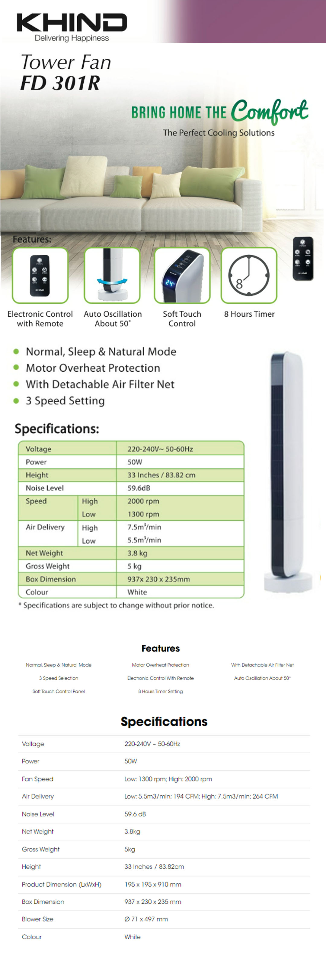 KHIND 50W Tower Fan FD301R | Auto Oscillation | Motor Overheat Protection | With Detachable Air Filter Net | 3 Speed Setting | Tower Fan with 1 Year Warranty