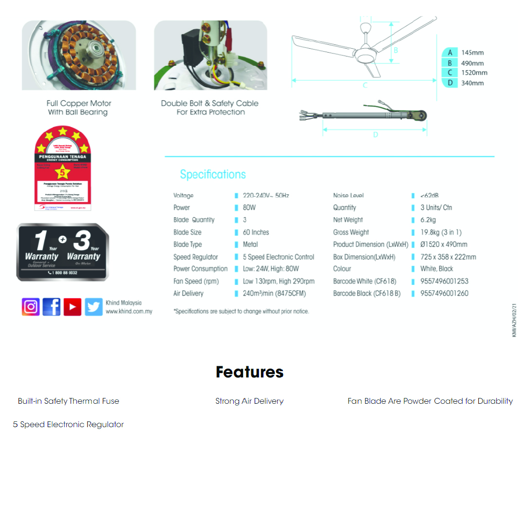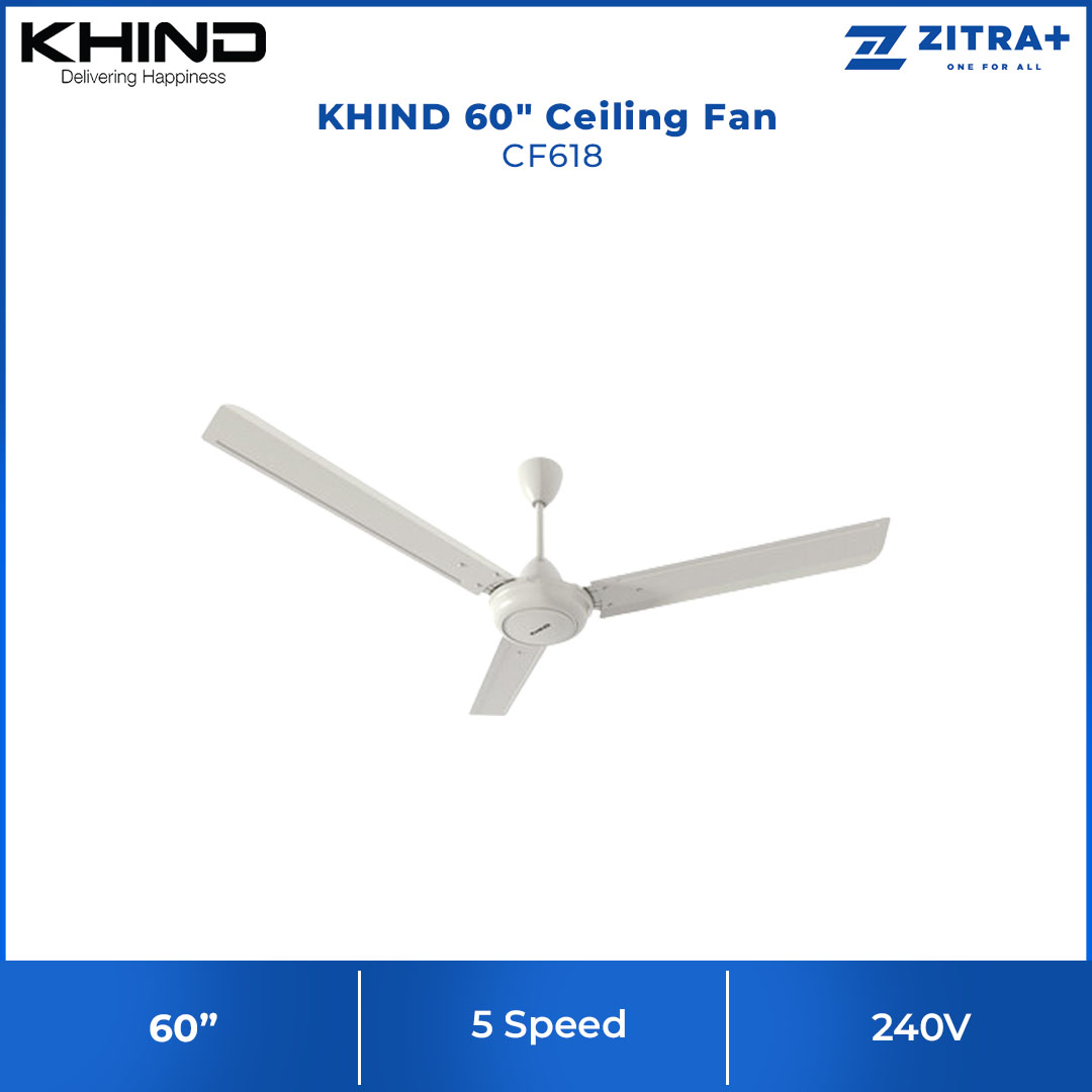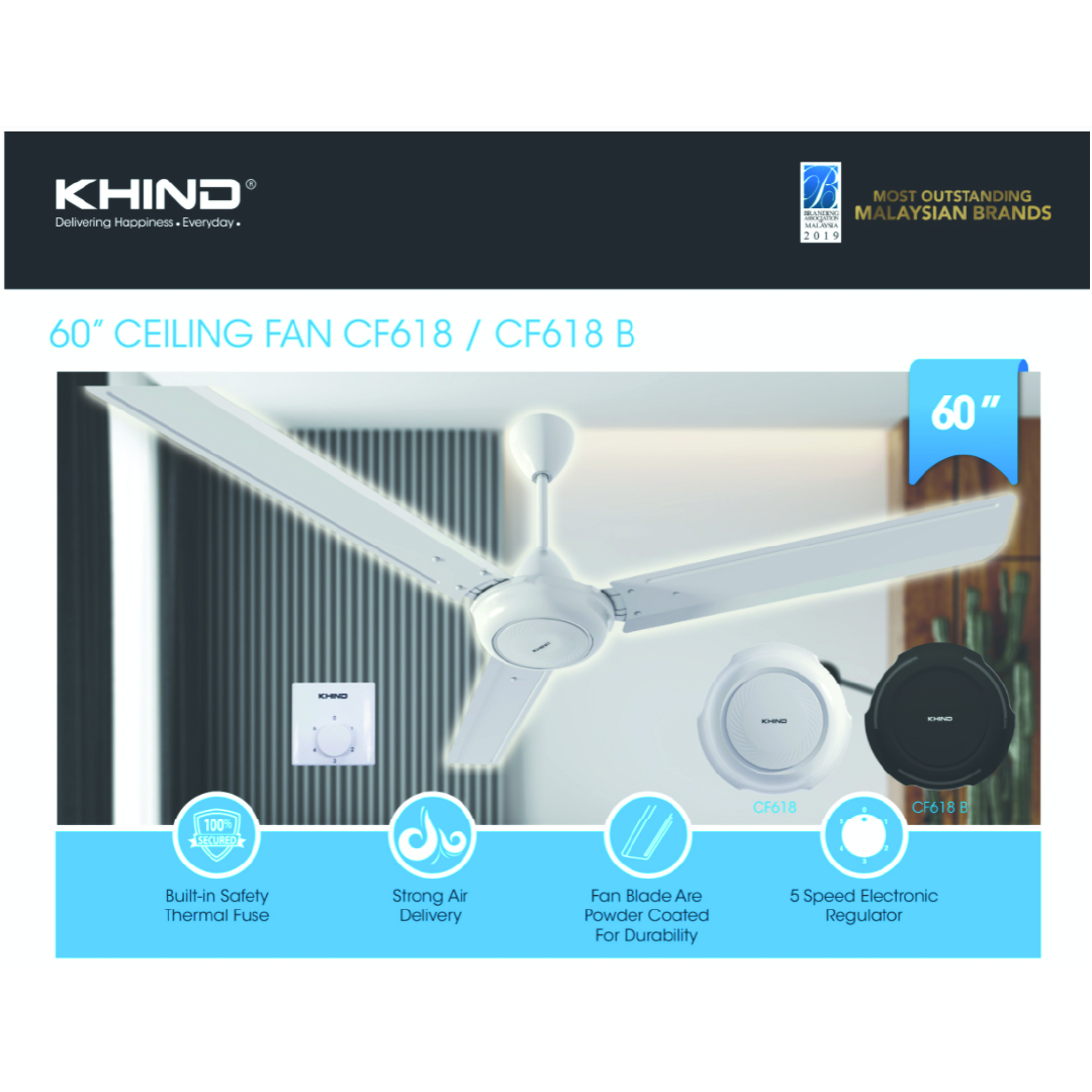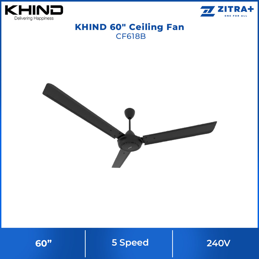 KHIND 60" Ceiling Fan CF618B / CF618 | Built-in Safety Thermal Fuse | 5 Speed Electronic Regulator | Strong Air Delivery | Fan Blade Are Powder Coated for Durability | Ceiling Fan with 1 Year General Warranty & 3 Years Motor Warranty