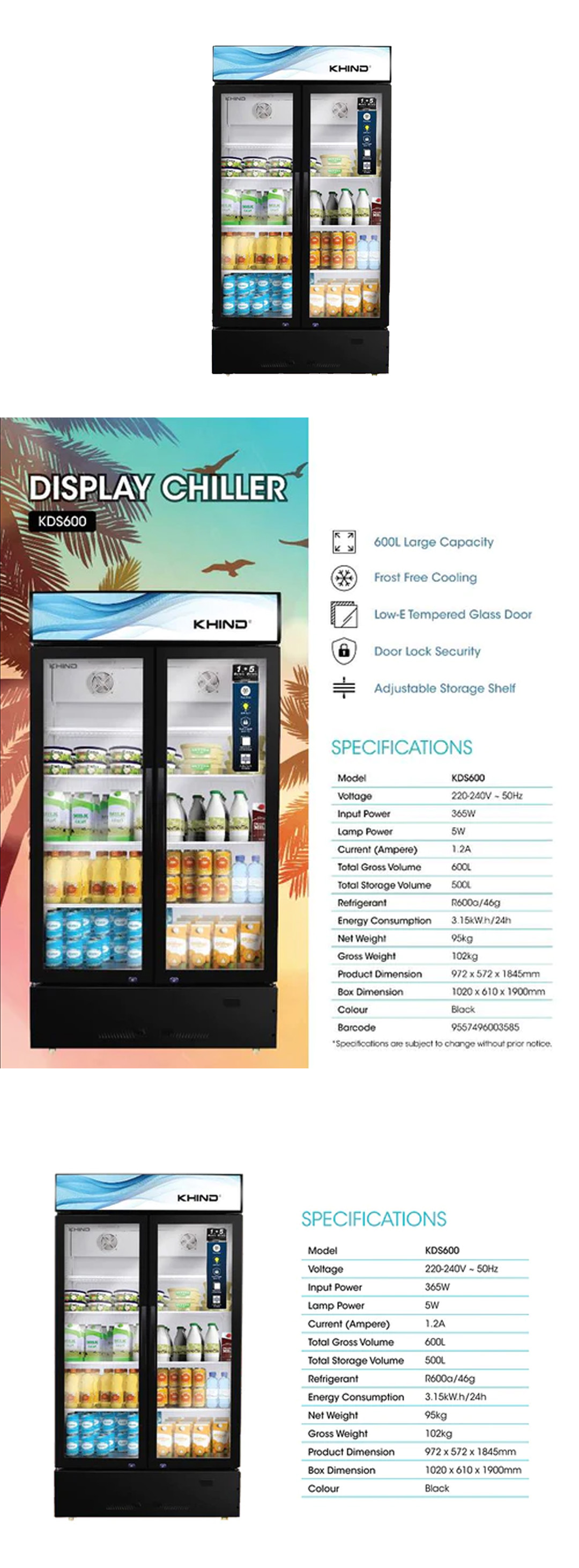 KHIND 600L 2 Doors Display Chiller KDS600 | Frost Free Cooling | Door Lock Security | Adjustable Storage Shelf | Display Chiller with 1 Year Warranty