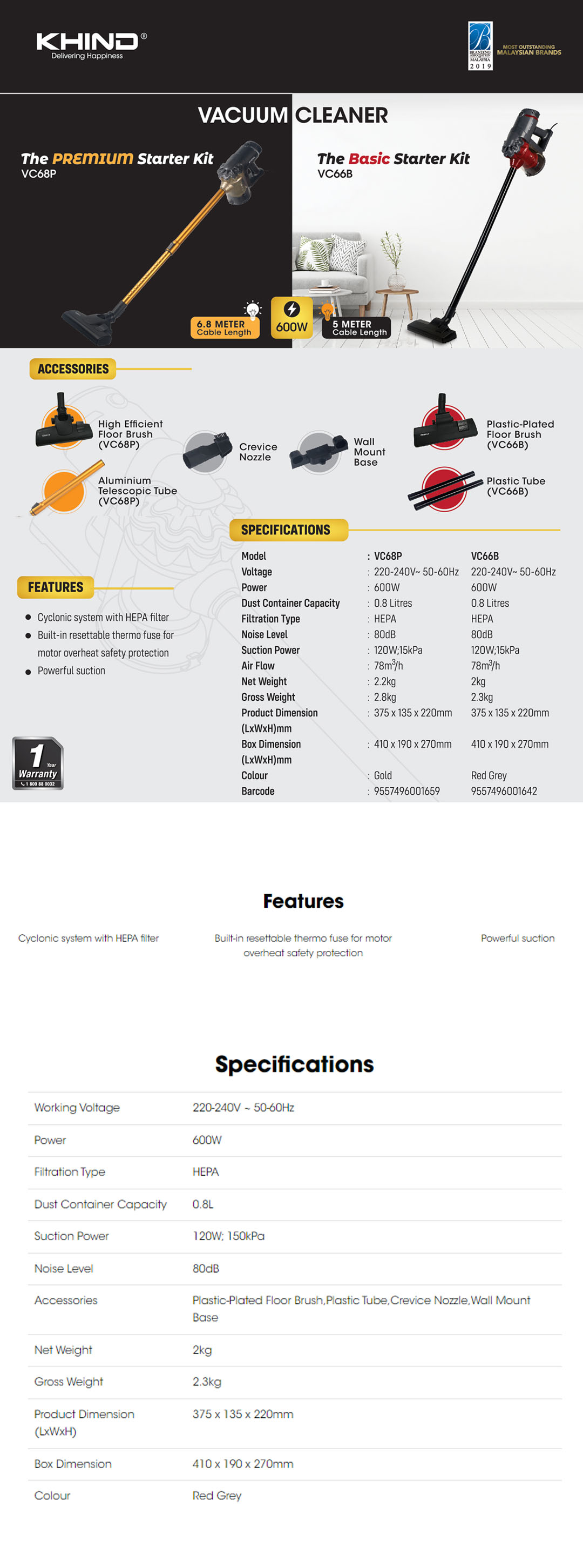 KHIND 600W Stick Vacuum Cleaner VC66B | Cyclonic system with HEPA filter | Powerful Suction | Motor Overheat Safety Protection | Vacuum Cleaner with 1 Year Warranty