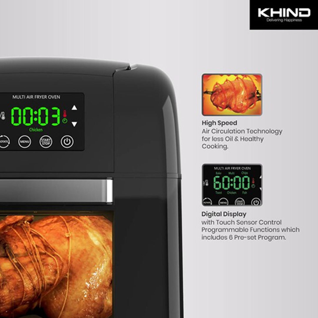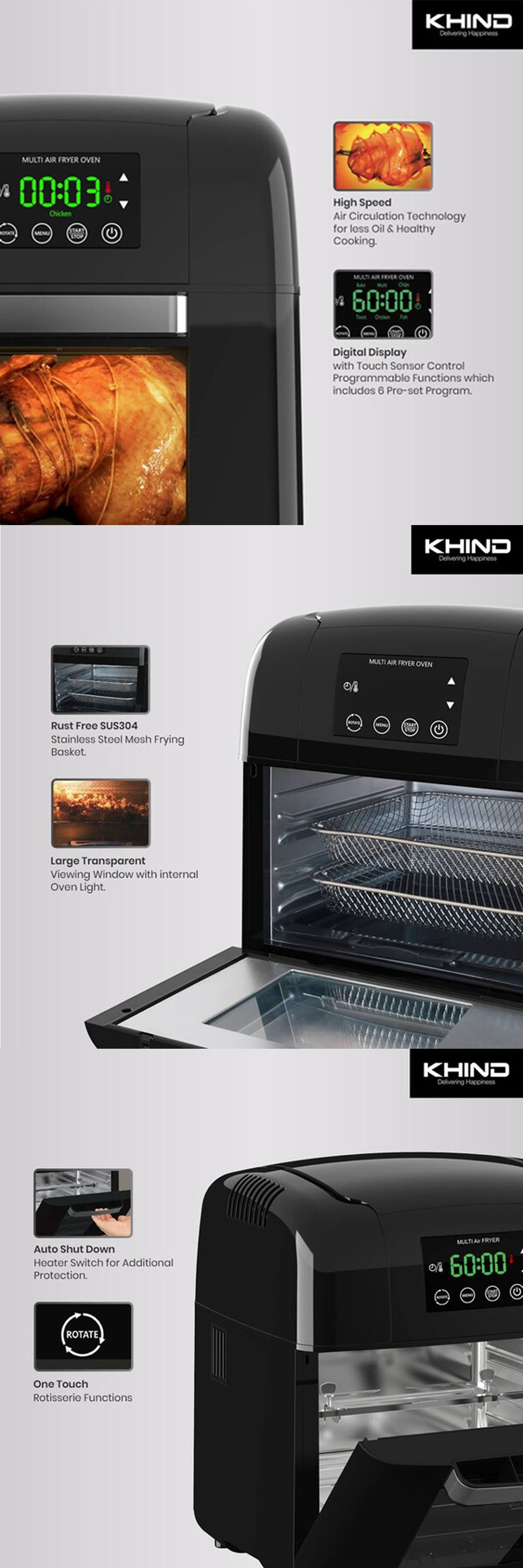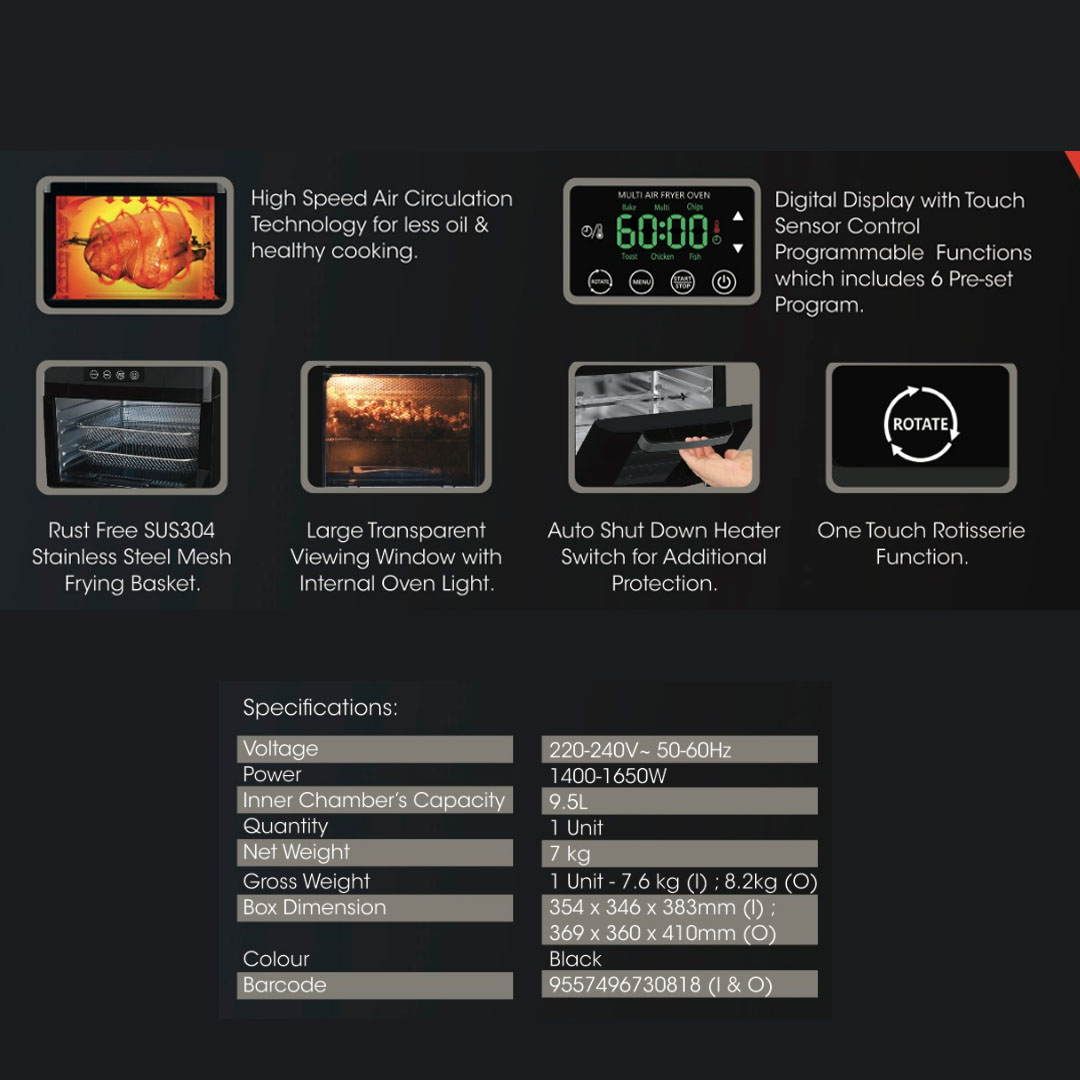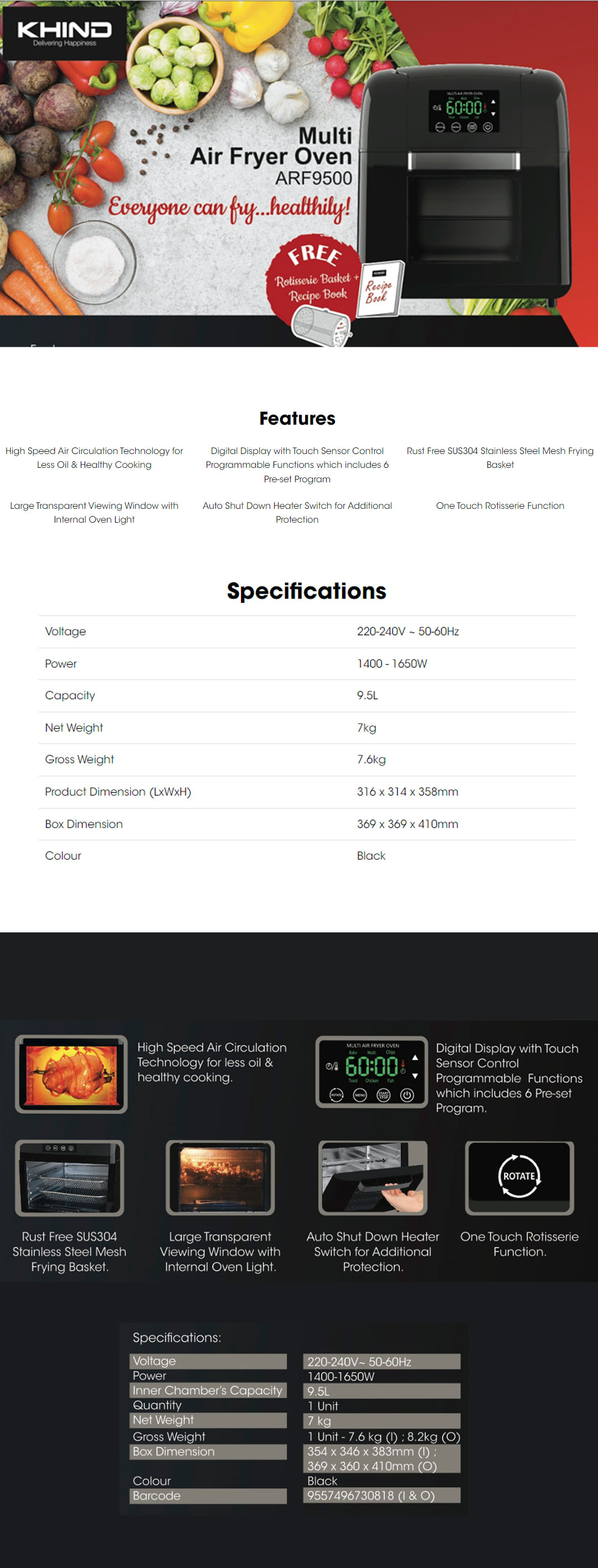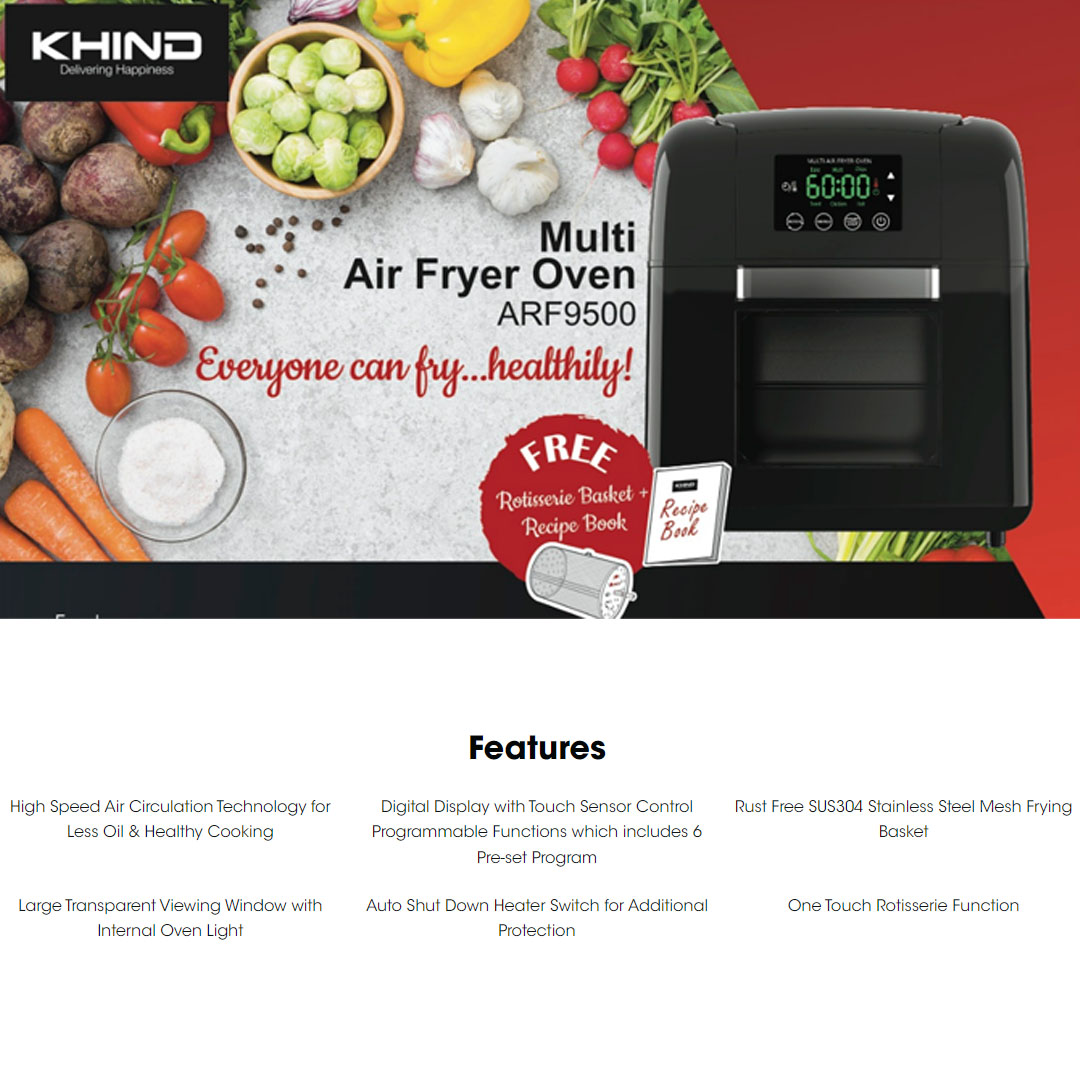 KHIND 9.5L Multi Air Fryer Oven ARF9500 | 6 Pre-set Program | High Speed Air Circulation Technology | Rust Free SUS304 Stainless Steel Mesh Frying Basket | Air Fryer with 1 Year Warranty