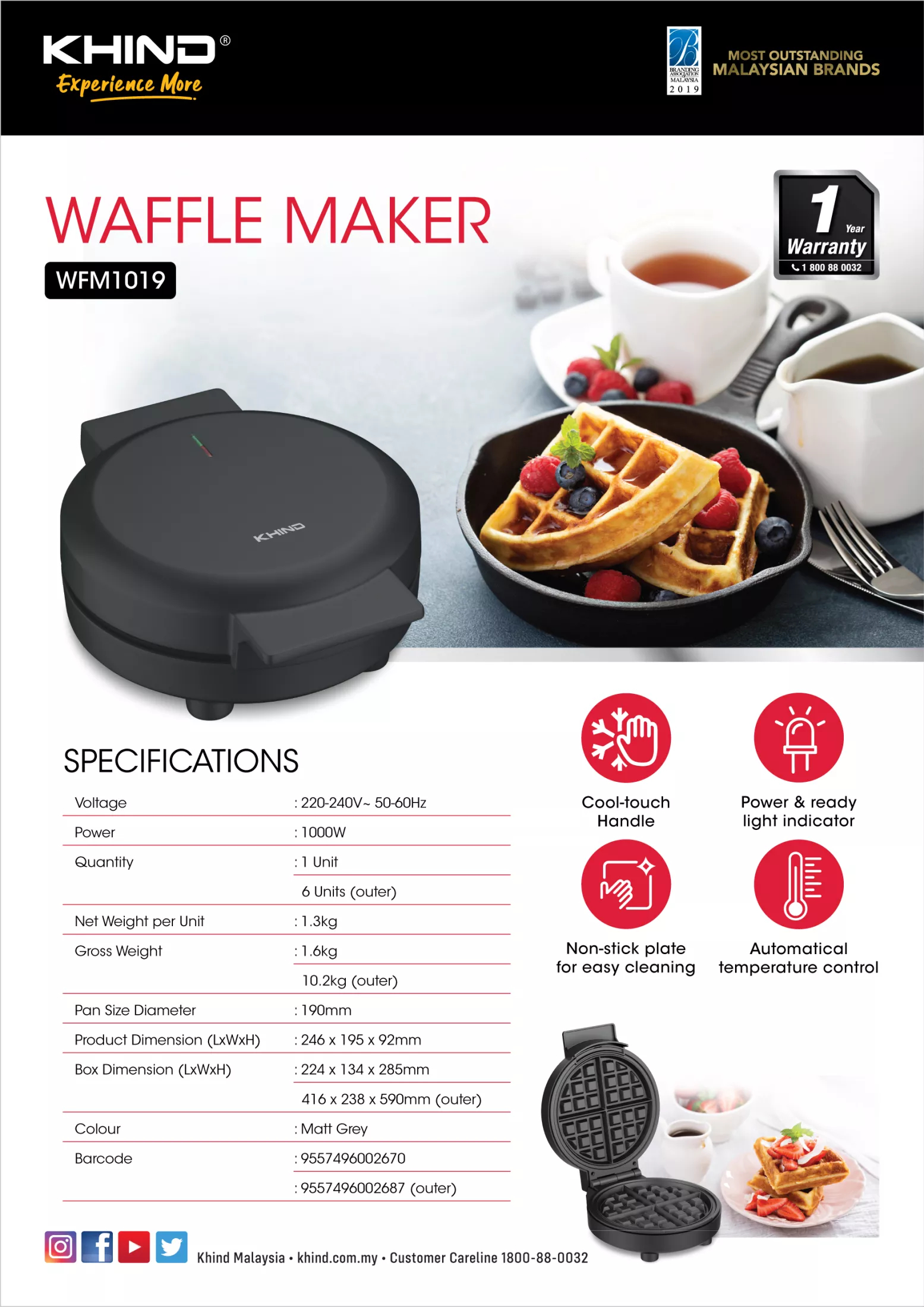 KHIND Waffle Maker WFM1019 | Cool-touch Handle | Power & Ready Light lndicator | Non-stick Plate For Easy Cleaning | Automatical Temperature Control | Waffle Maker with 1 Year General Warranty