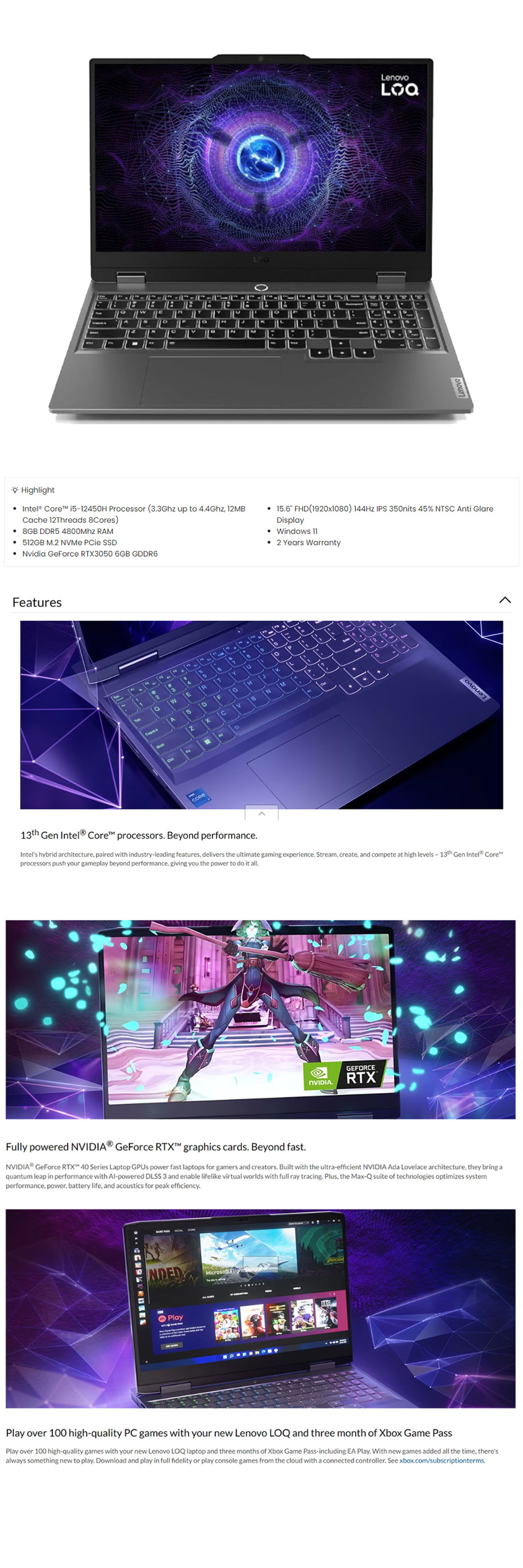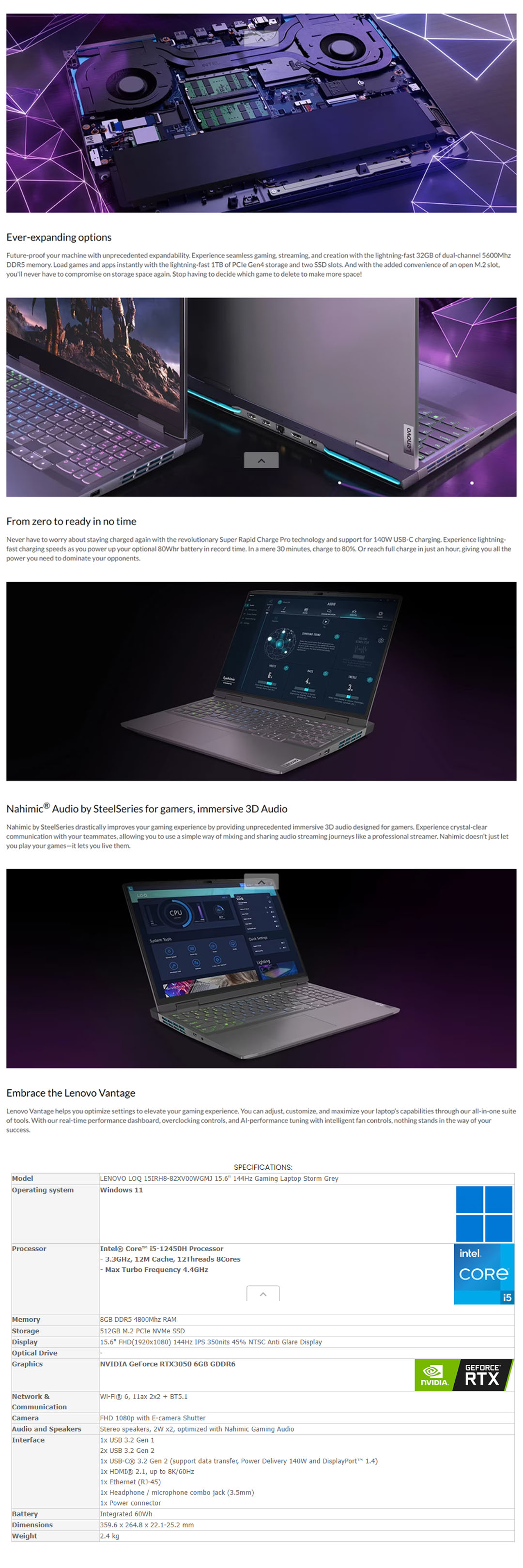 Lenovo LOQ 15IRH8 Laptop 82XV00WGMJ (Intel Core i5-12450H/ 8GB+512GB / 15.6-inch / ) | 170W Slim Tip (3-pin) | Windows 11 Home | AI Chip: LA1 | Laptop with 2 Years Warranty