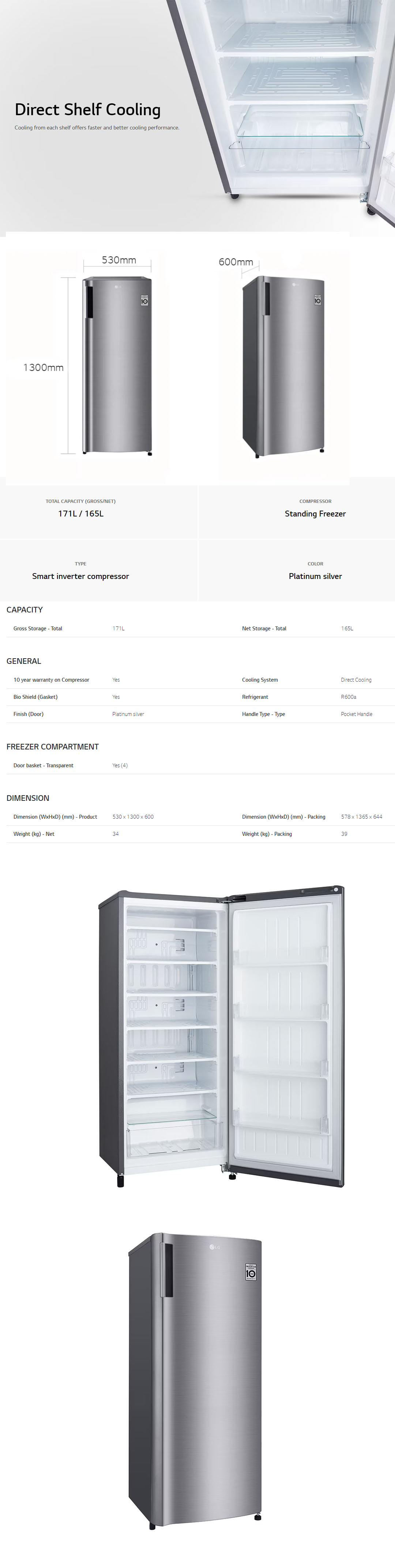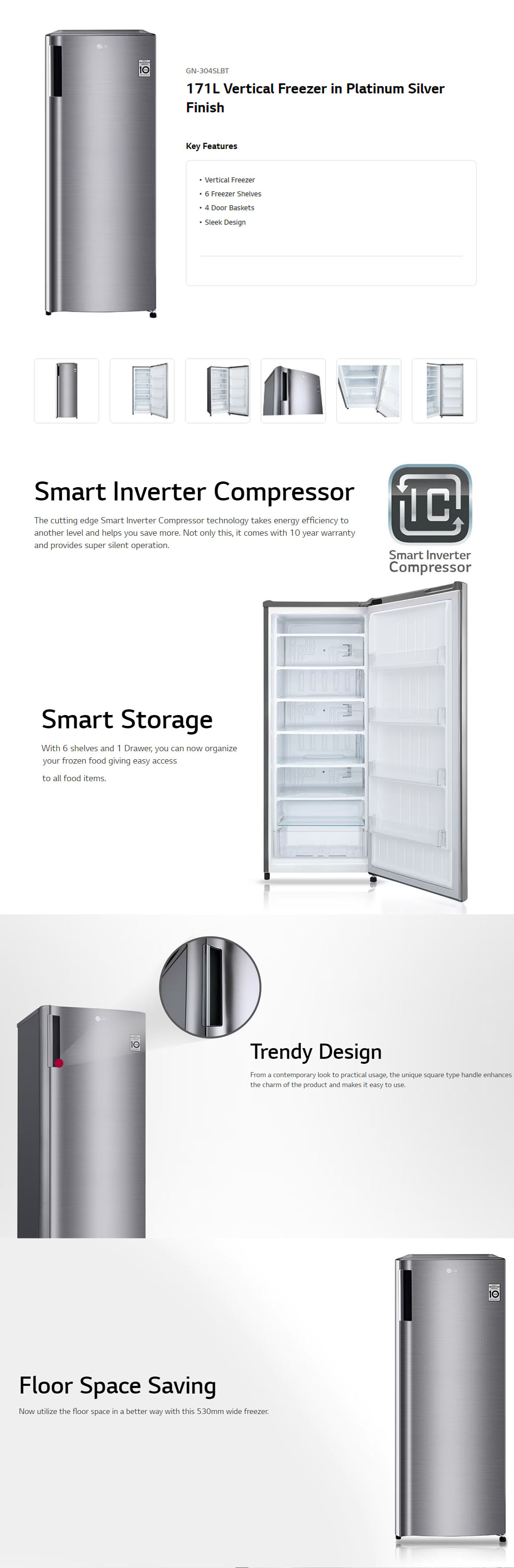 LG 171L Smart Inverter Upright Freezer GN-304SLBT | 6 Freezer Shelves | 4 Door Baskets | Sleek Design | Freezer with 1 Year Warranty