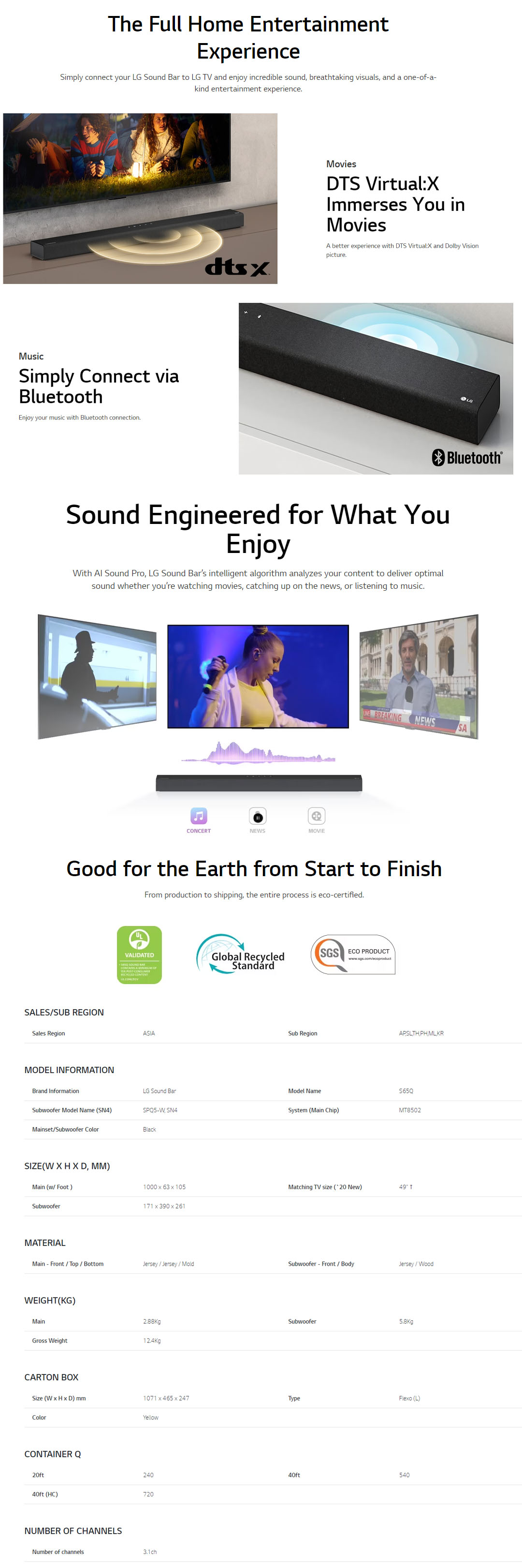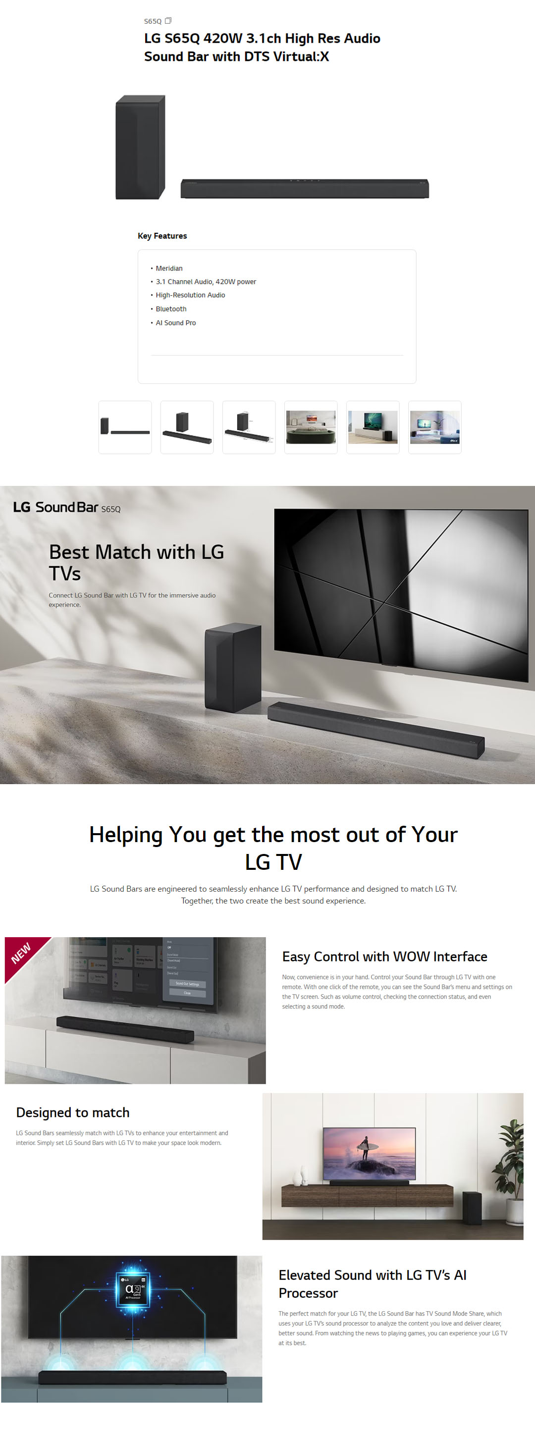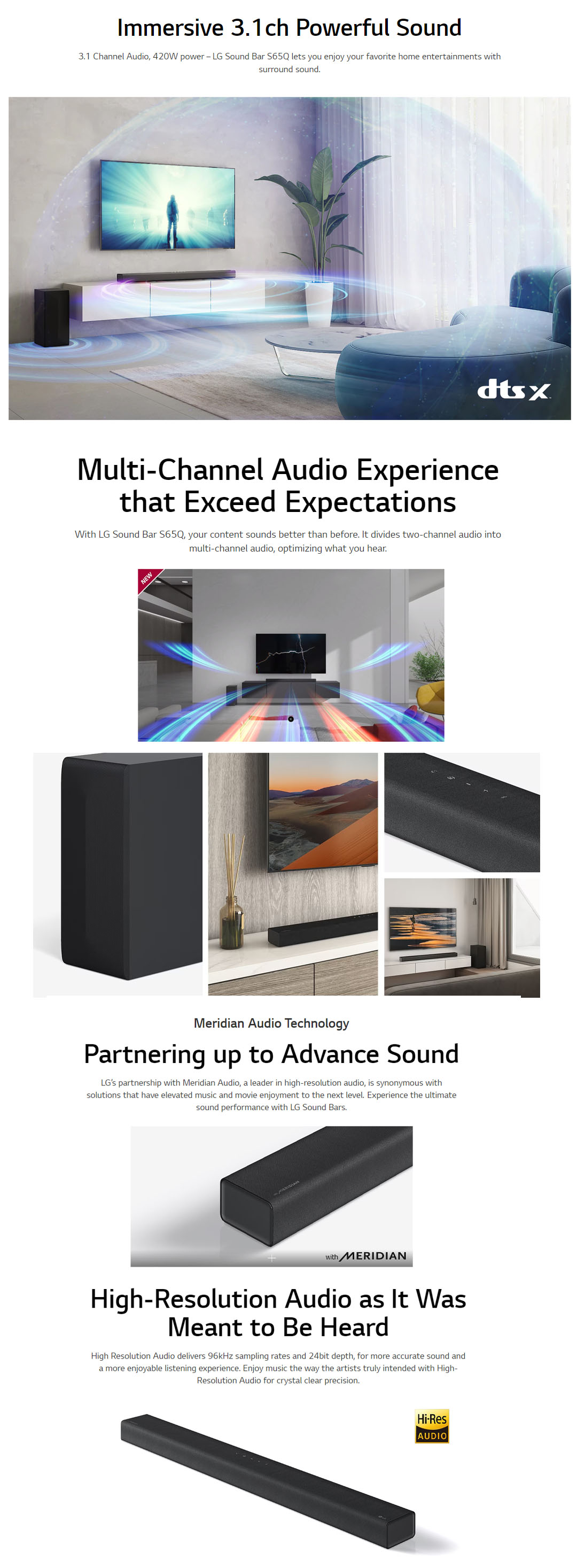 LG 420W Sound Bar with DTS Virtual:X S65Q | AI Sound Pro | Meridian | 3.1 Channel Audio | Sound Bar with 1 Year Warranty