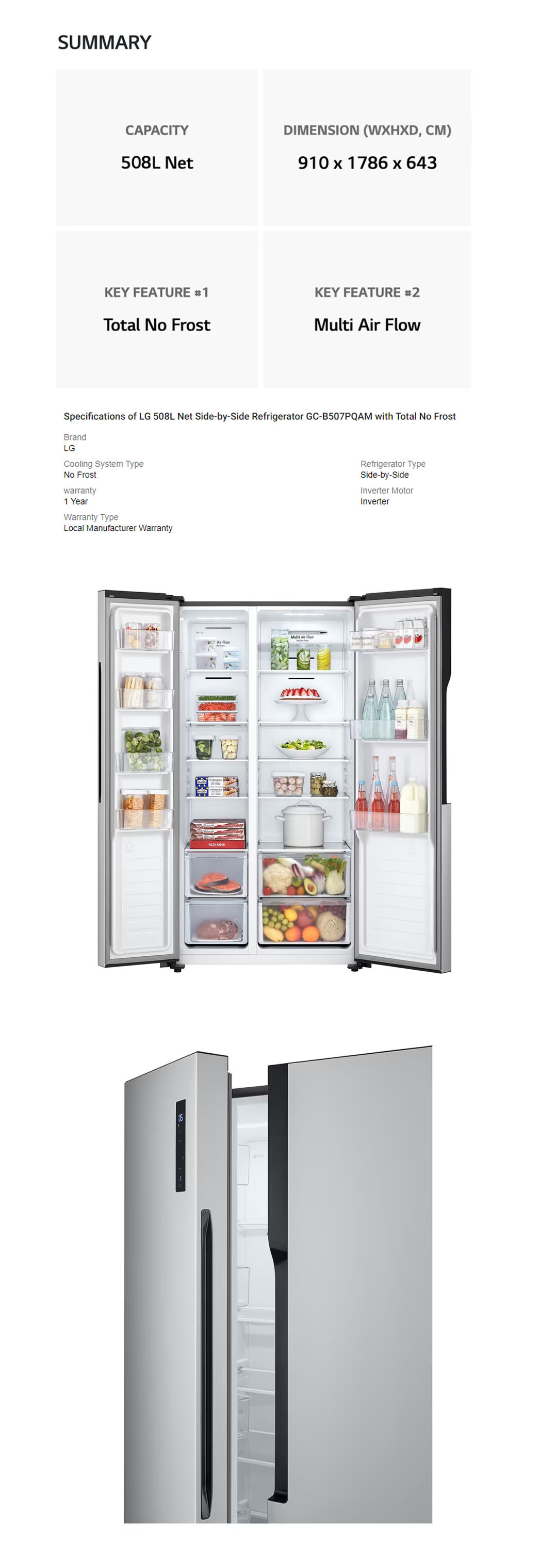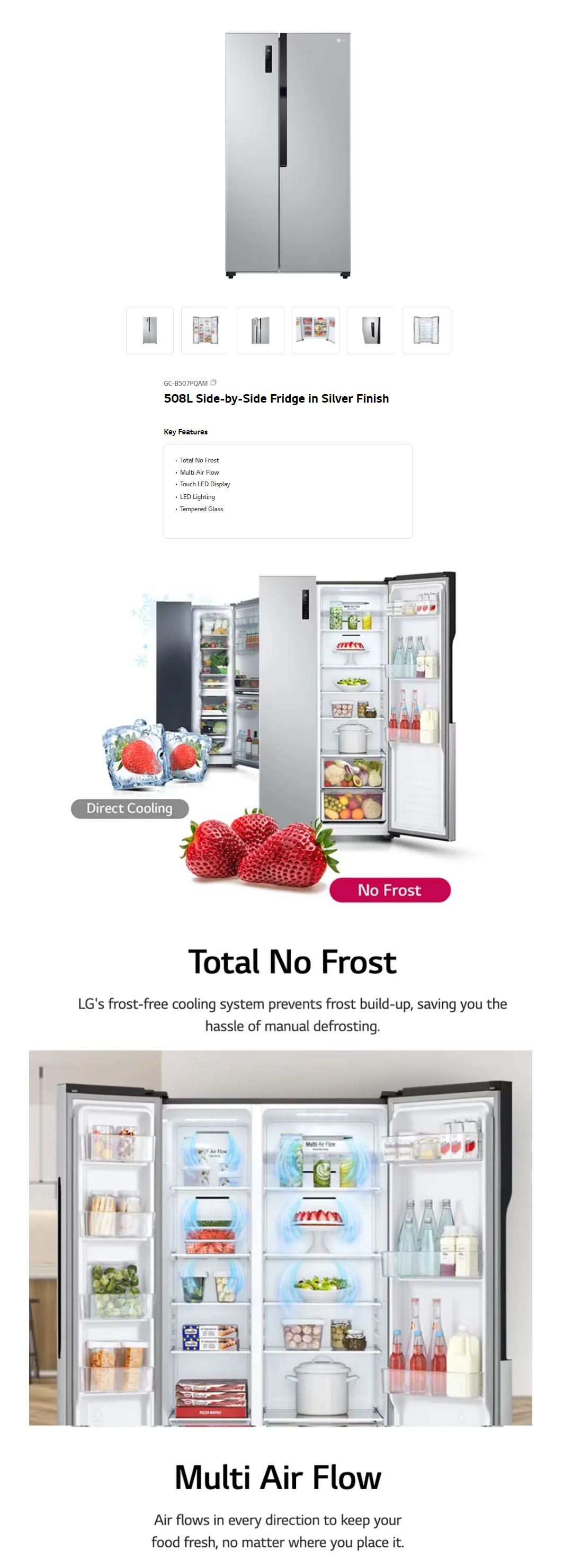 LG 508L Side by Side Smart Inverter Refrigerator GC-B507PQAM | Total No Frost | Tempered Glass | Multi Air Flow | Touch LED Display | Refrigerator with 1 Year Warranty