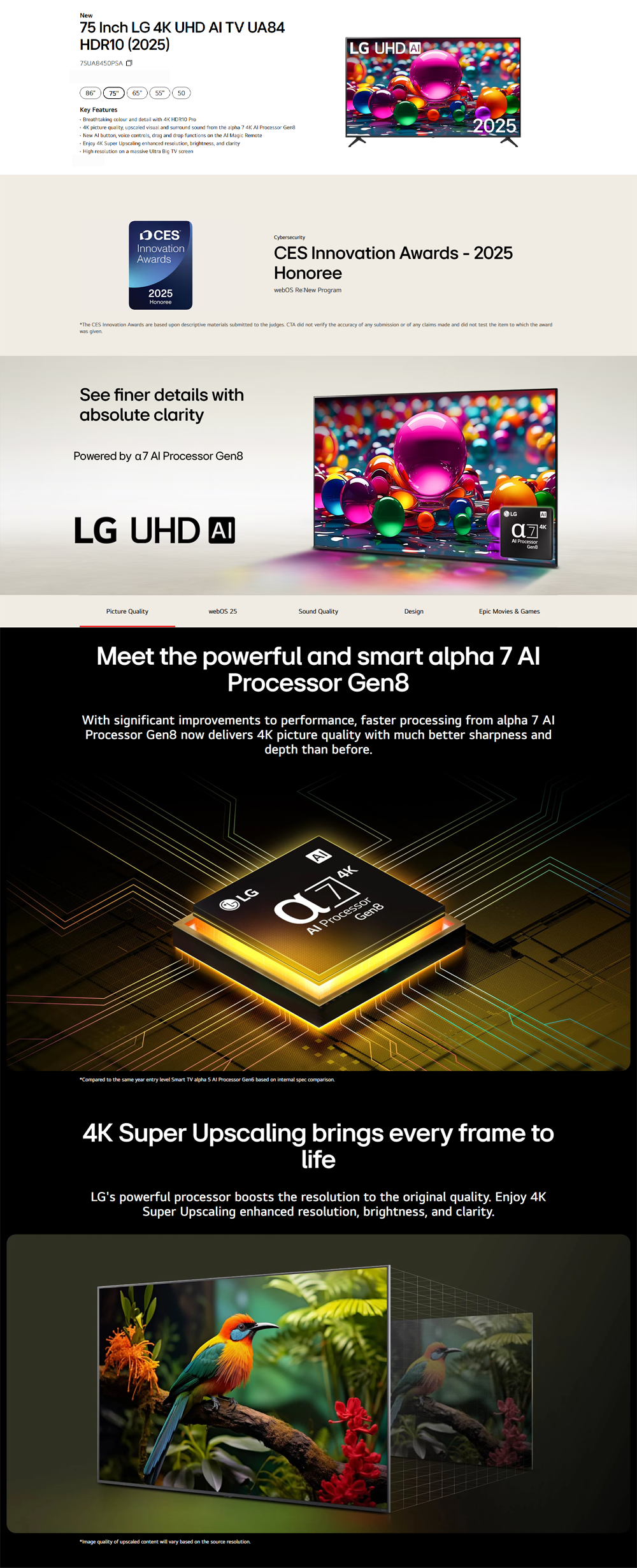 LG 75"/86" 4K UHD AI TV UA84 Smart TV 75UA8450PSA/ 86UA8450PSA | 4K HDR10 Pro | 7 4K AI Processor Gen8 | AI Sound Pro | FILMMAKER MODE