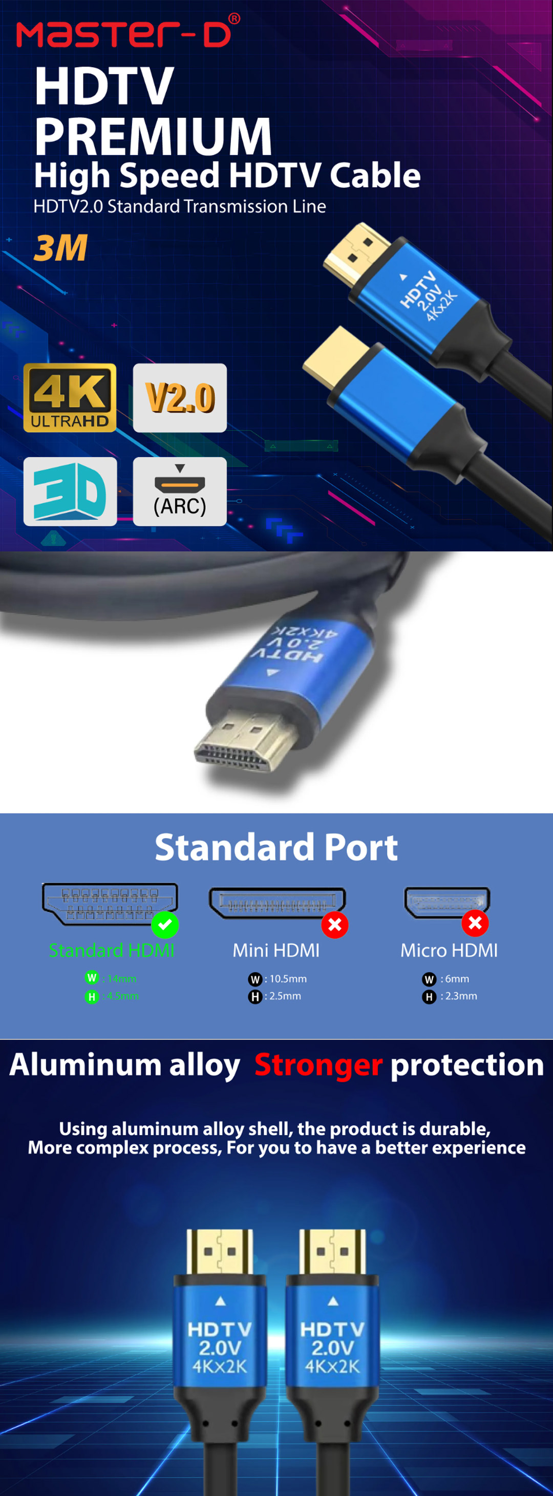 Master D 3m HDMI 2.0 4K High Speed HDTV Cable HDMI-191(3M) | Support: 3D, Up to 2160P Resolution | HDR Display | ARC