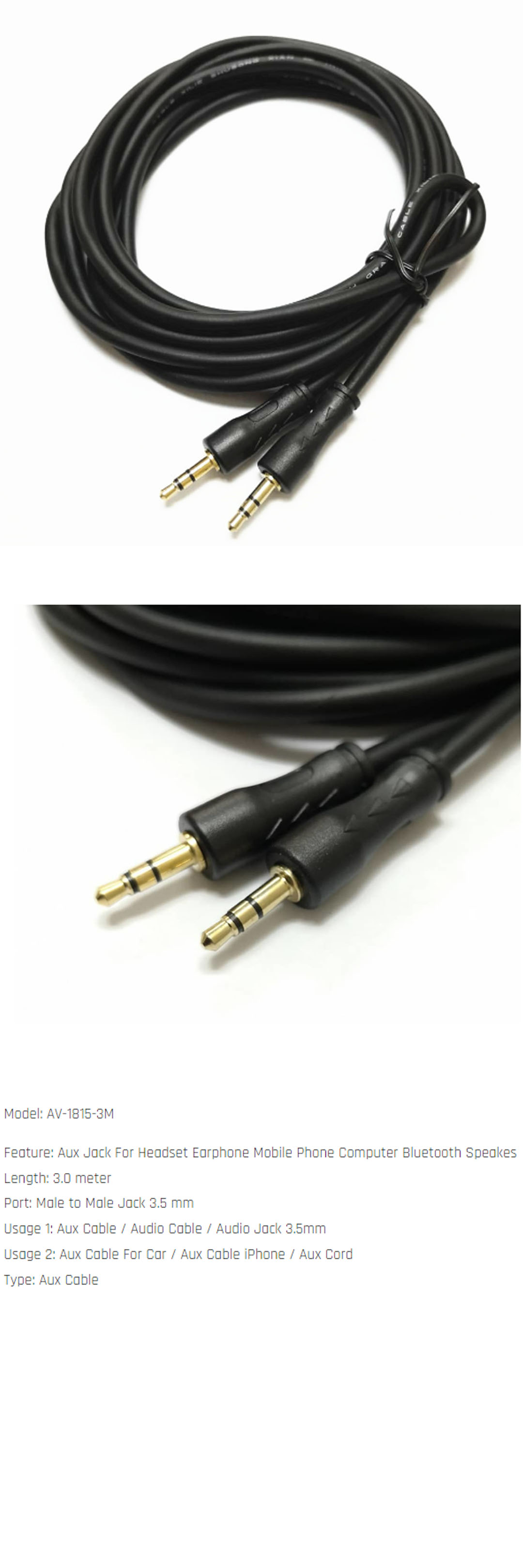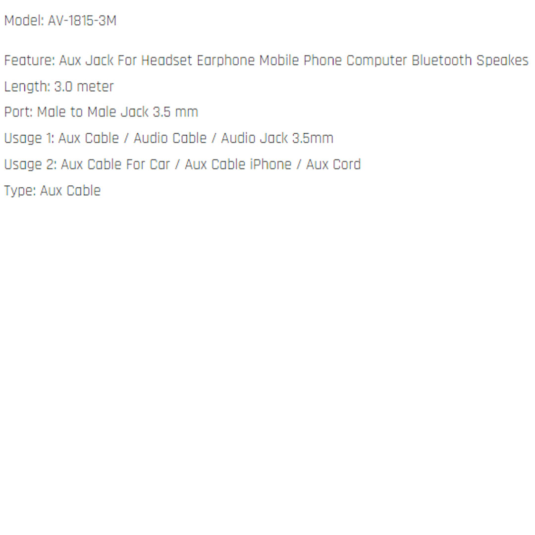Model: AV-1815-3M Length: 3 Meter Port: Male to Male Jack 3.5mm