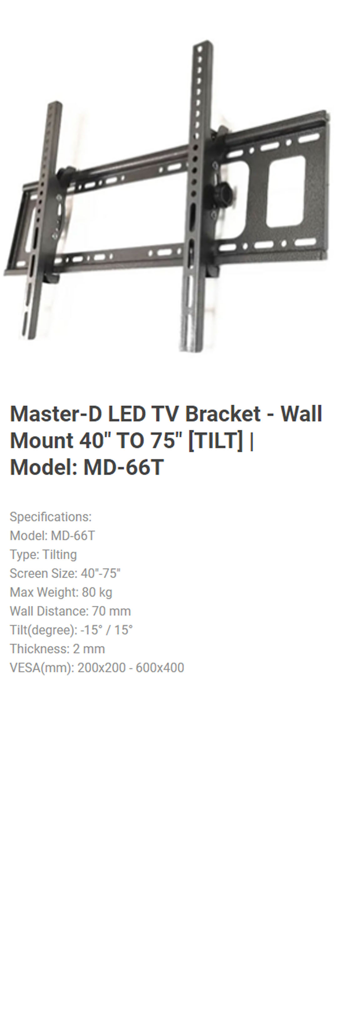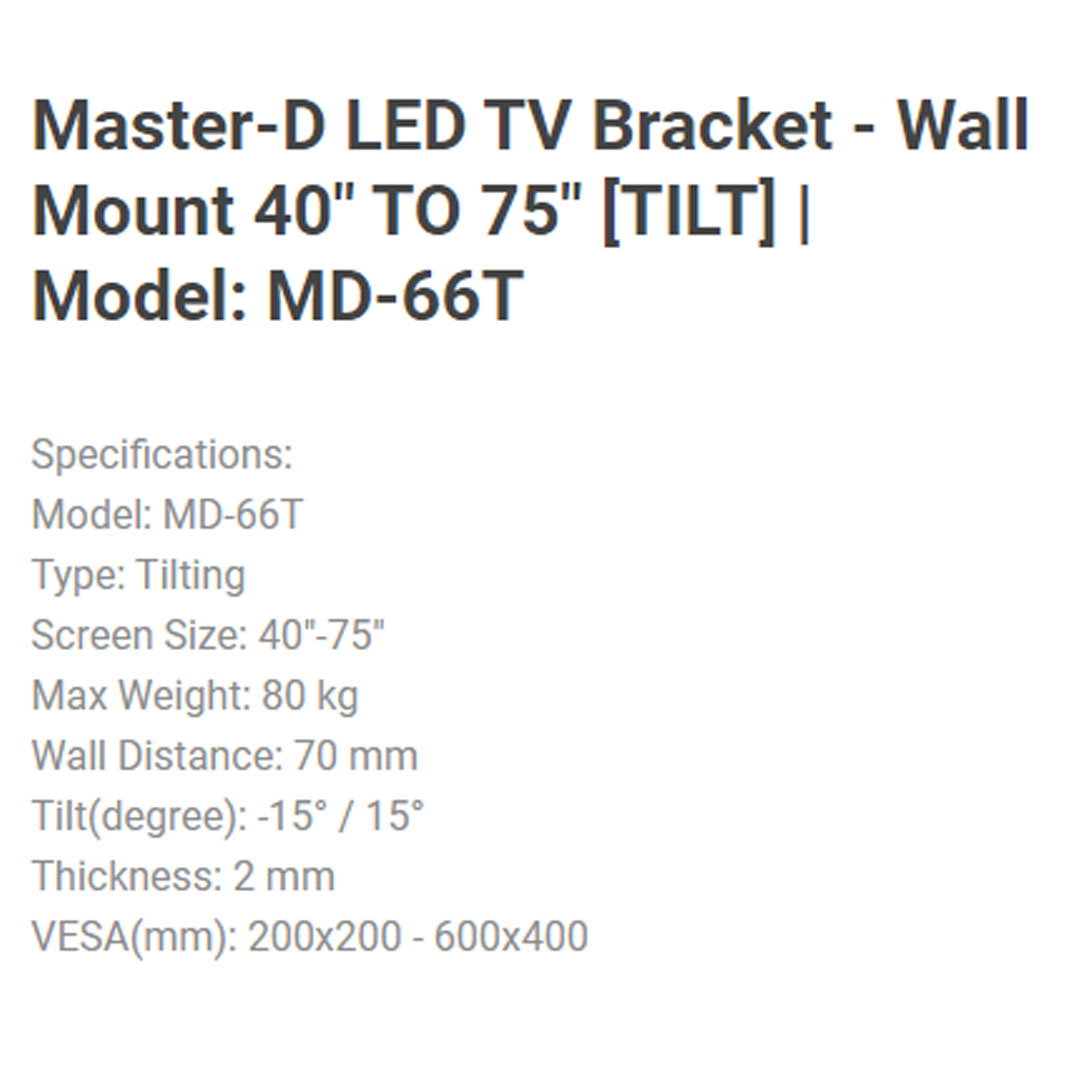 Master D 40"-75" LED TV BRACKET - Wall Mount (TILT) MD-66T | Max Weight: 80Kg | Wall Distance: 70mm | Thickness: 2mm |