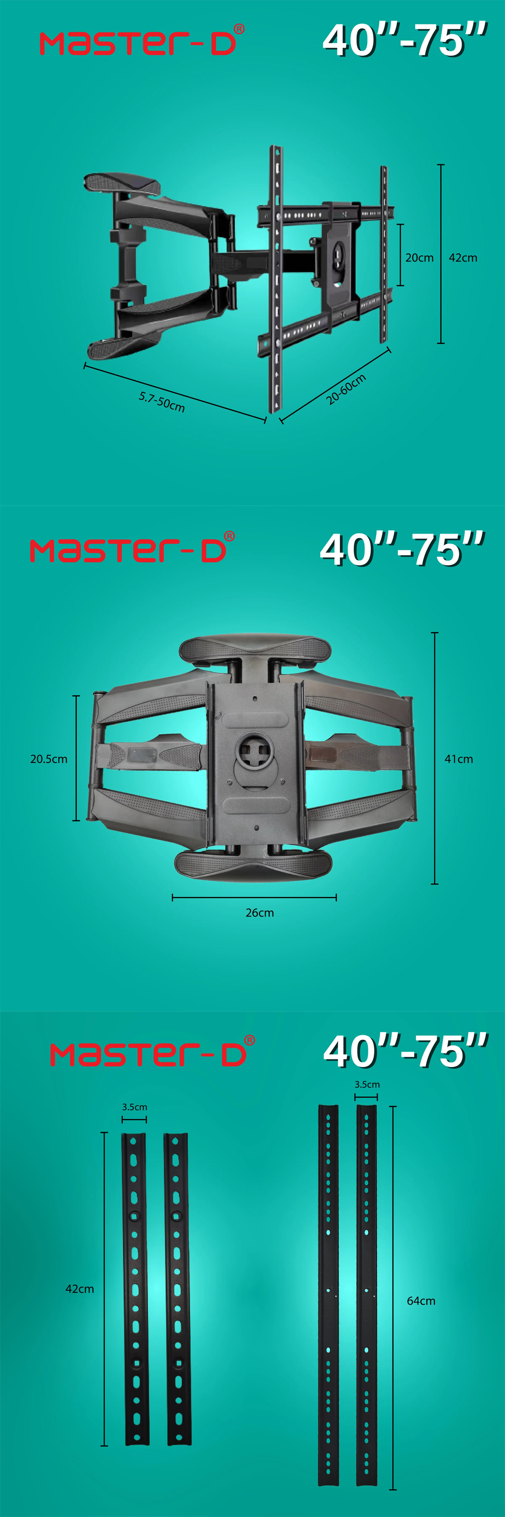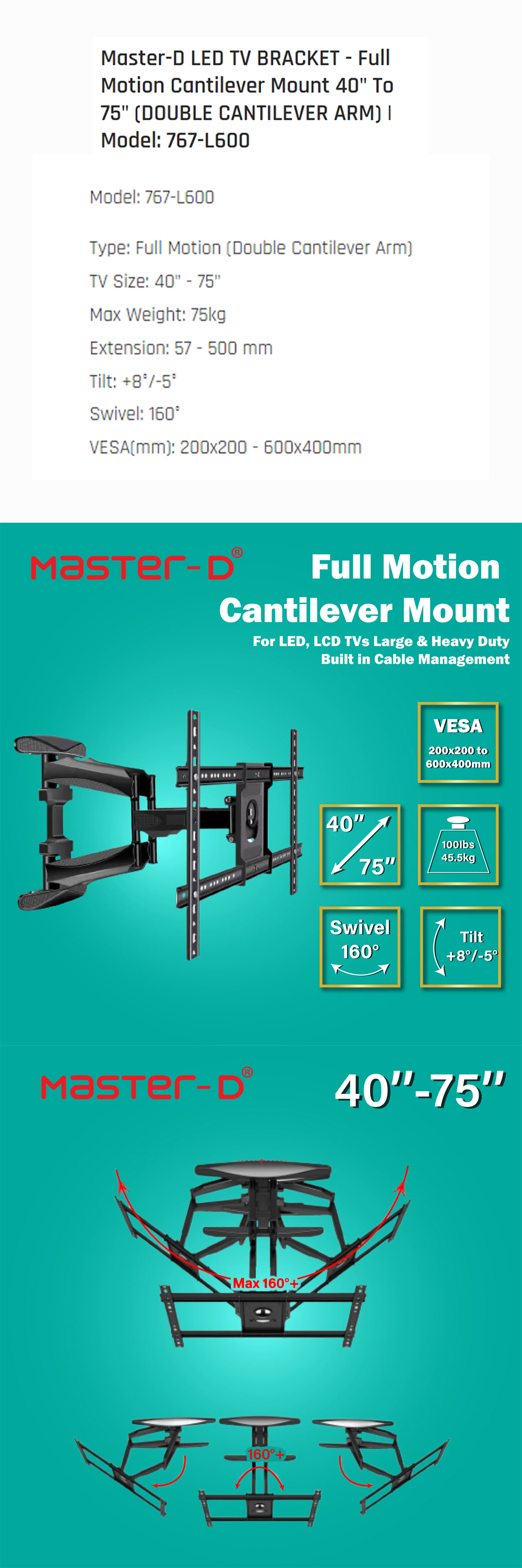 Master D 40"-75" LED TV BRACKET - Full Motion Cantilever Mount (DOUBLE CANTILEVER ARM) 767-L600 | Max Weight: 75kg | Extension: 57 - 500 mm | Tilt: +8°/-5° | Swivel: 160°
