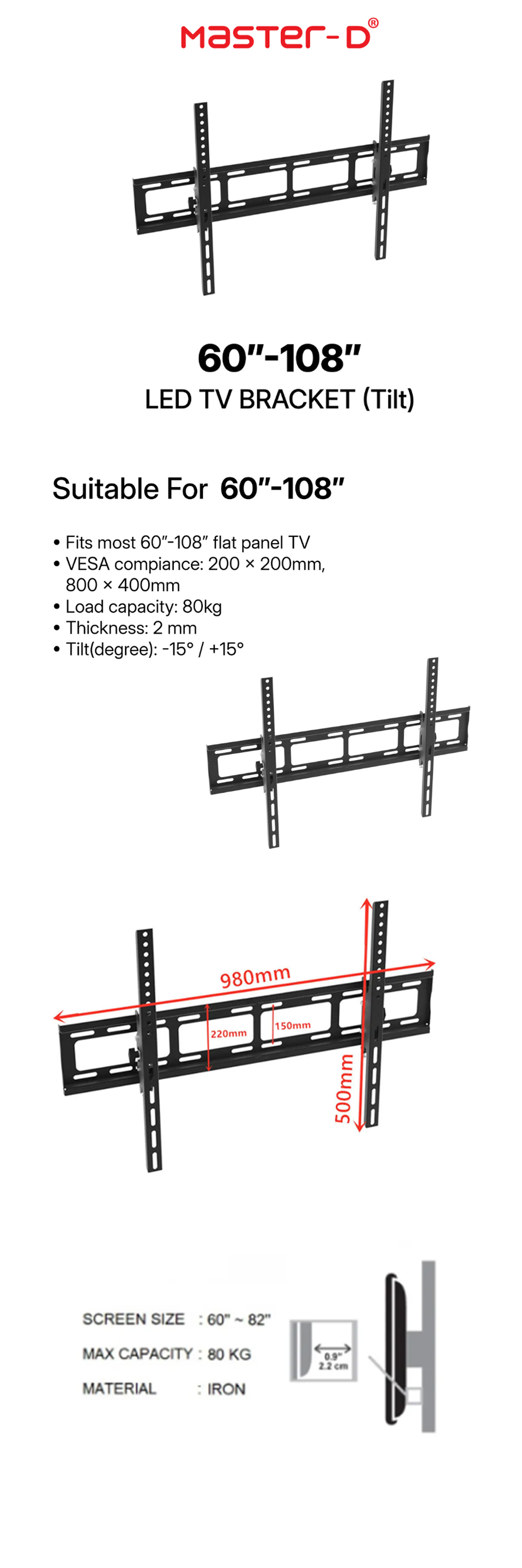 Master D 60"-108" LED TV BRACKET - Wall Mount (TILT) AD-925 | Max Weight: 80 kg | Wall Distance : 80 mm |