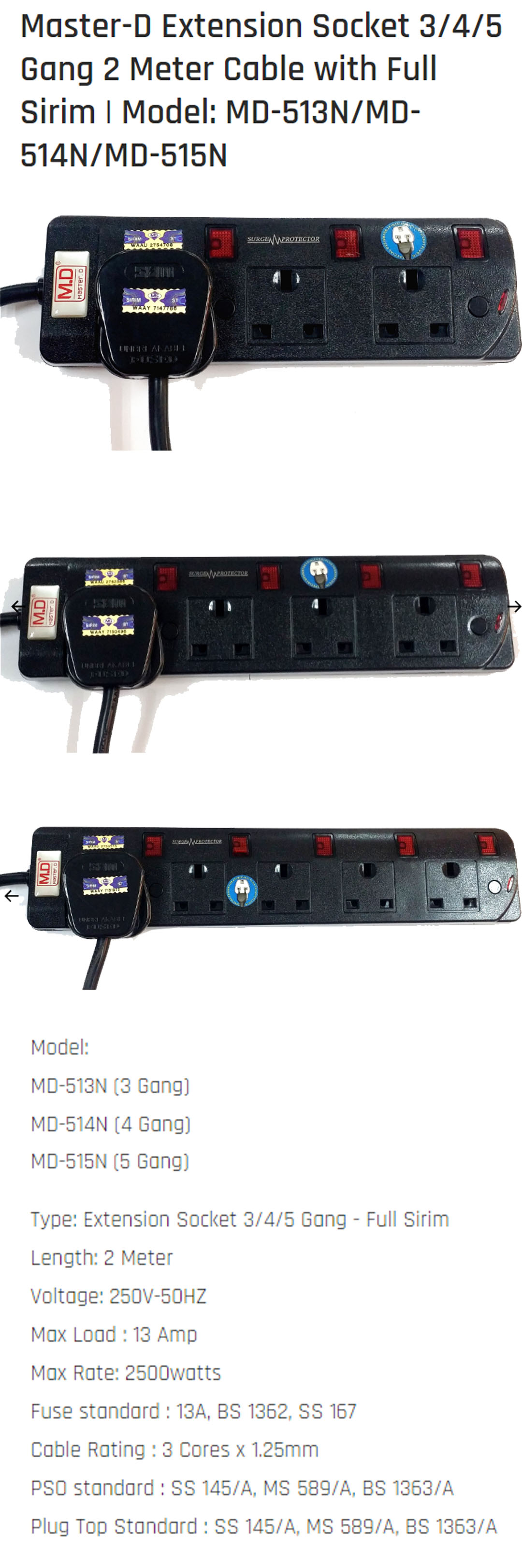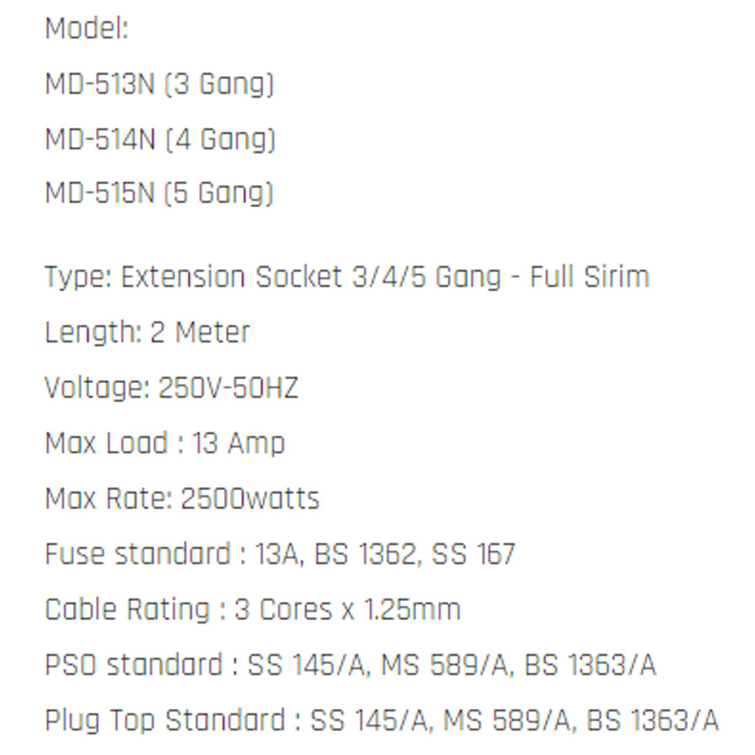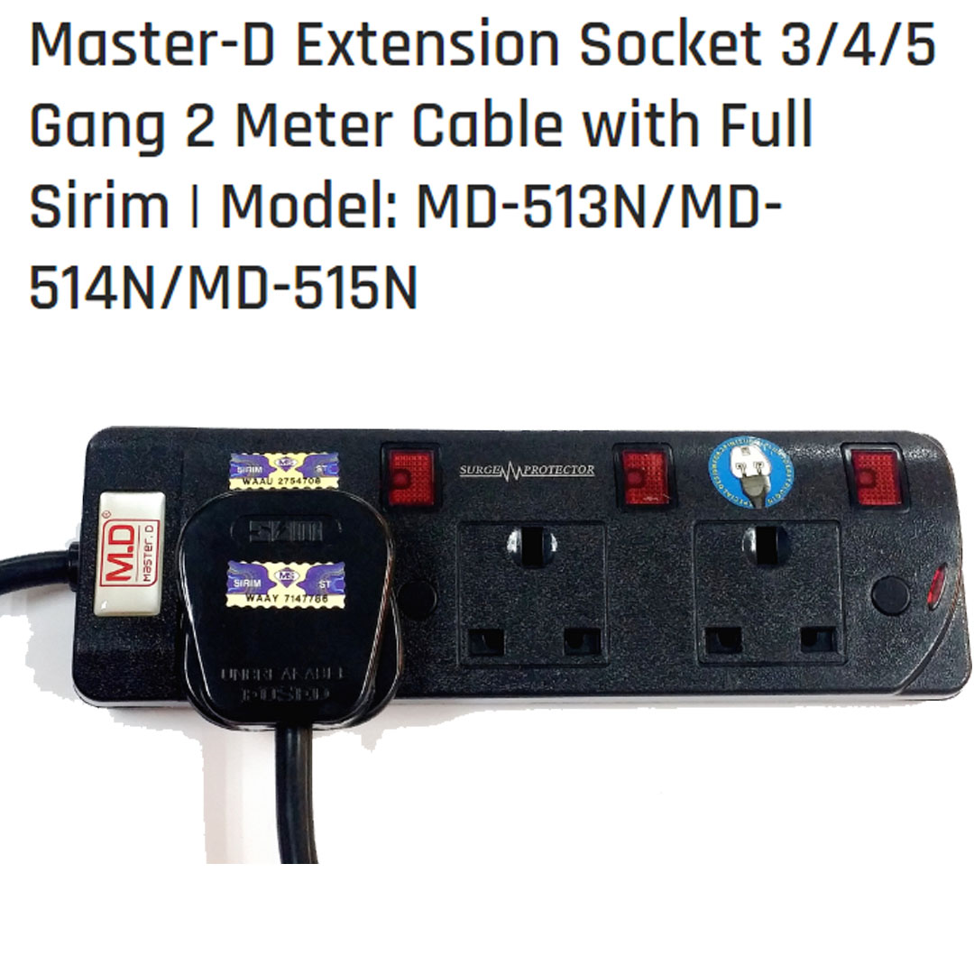 Master D Extension Socket 3/4/5 Gang 2 Meter Cable with Full Sirim MD-513/514/515N | Voltage 250V-50HZ | Max Load: 13AMP | Max Rate: 2500watts |