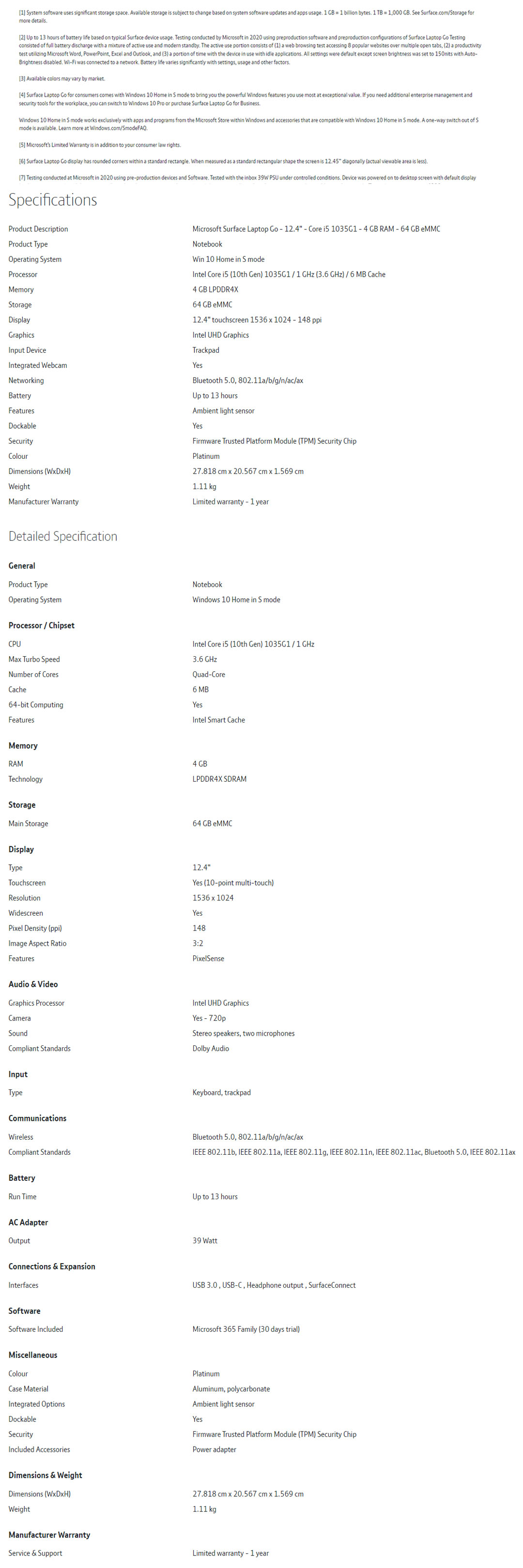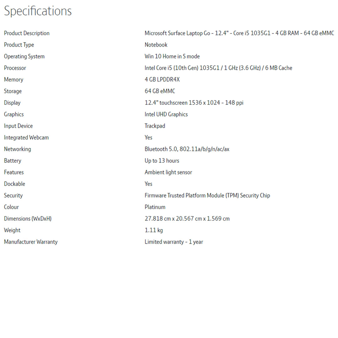 Microsoft Surface Laptop Go Laptop 1ZO-00018 (Intel Core i5-1035G1/ 4GB+64GB SSD/ 12.4-inch HD/ W10) | Windows 10 Home | Up to 13 Hours Battery Life | Bluetooth 5.0 | Laptop with 1 Year Warranty