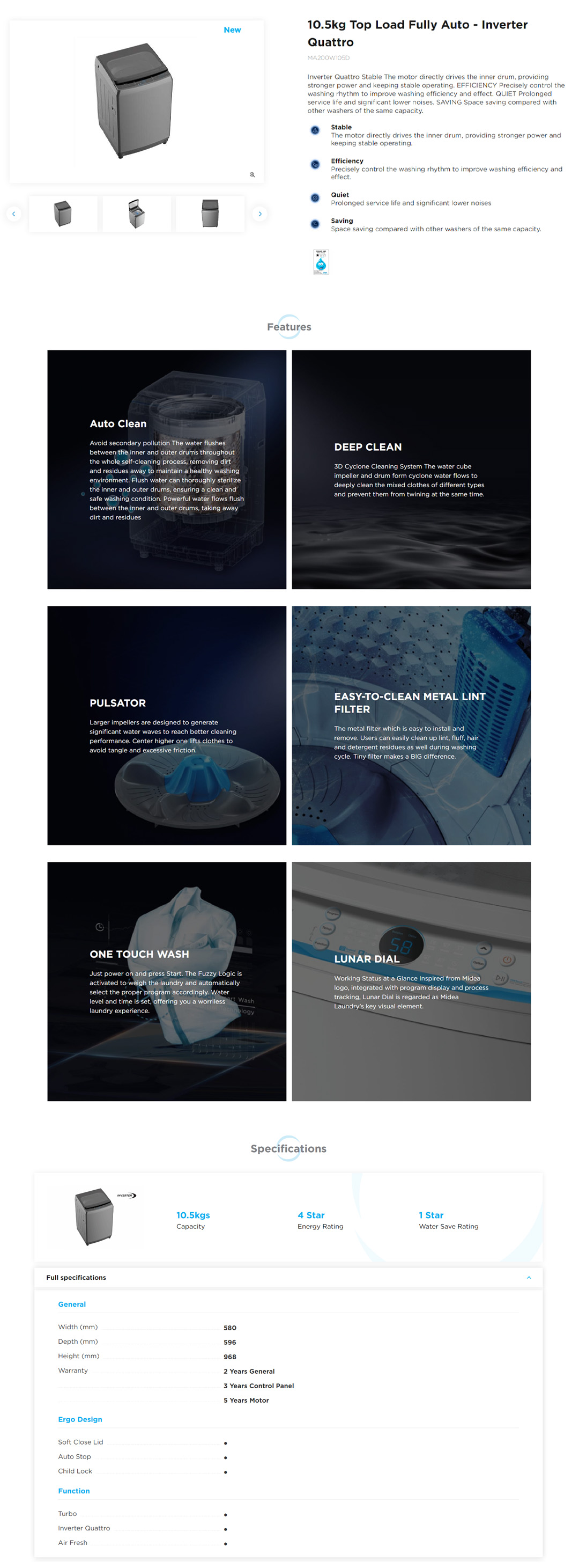 Midea 10.5KG Top Load Washing Machine With Inverter Quattro MA200W105D | Soft Close Lid | Auto Stop | Child Lock | Washing Machine with 2 Years Warranty