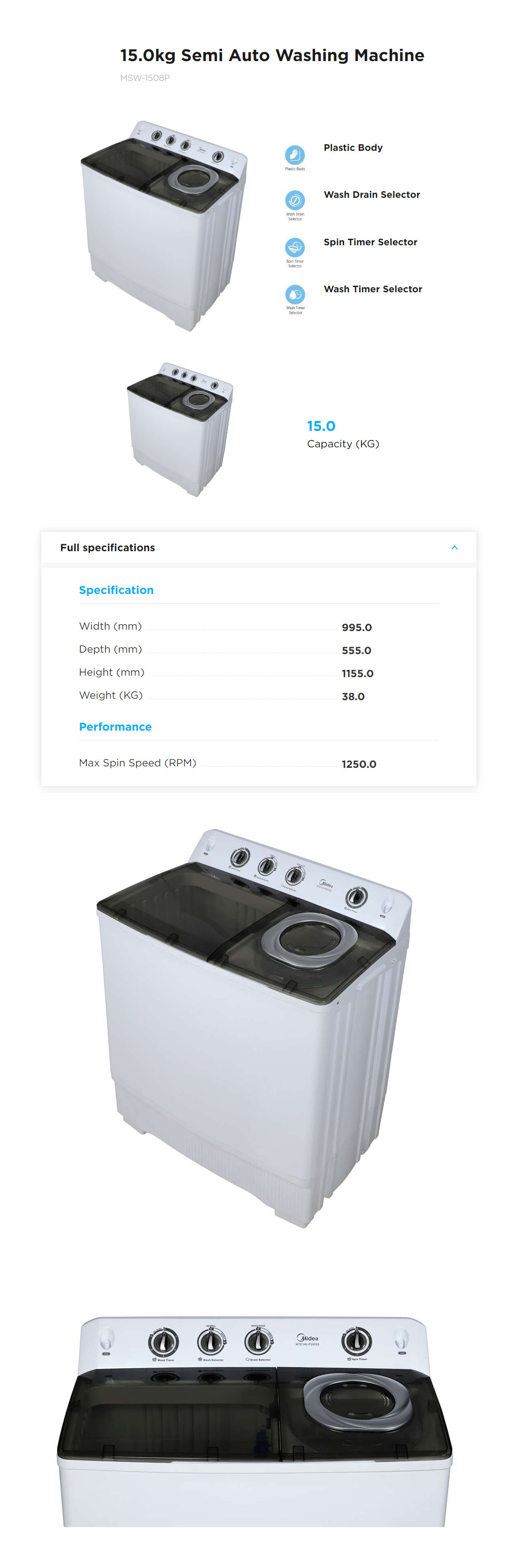 Midea 15KG Semi-Auto Washing Machine MSW-1508P | Wash Drain Selector | Wash Timer Selector | Spin Timer Selector | Fibre Body | Air Dry | Washing Machine with 1 Year Warranty