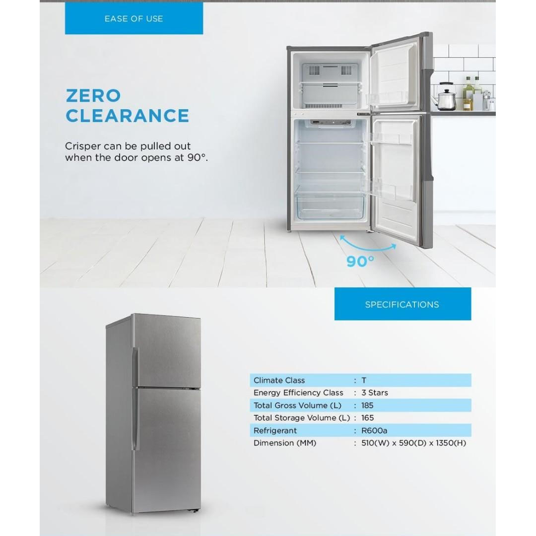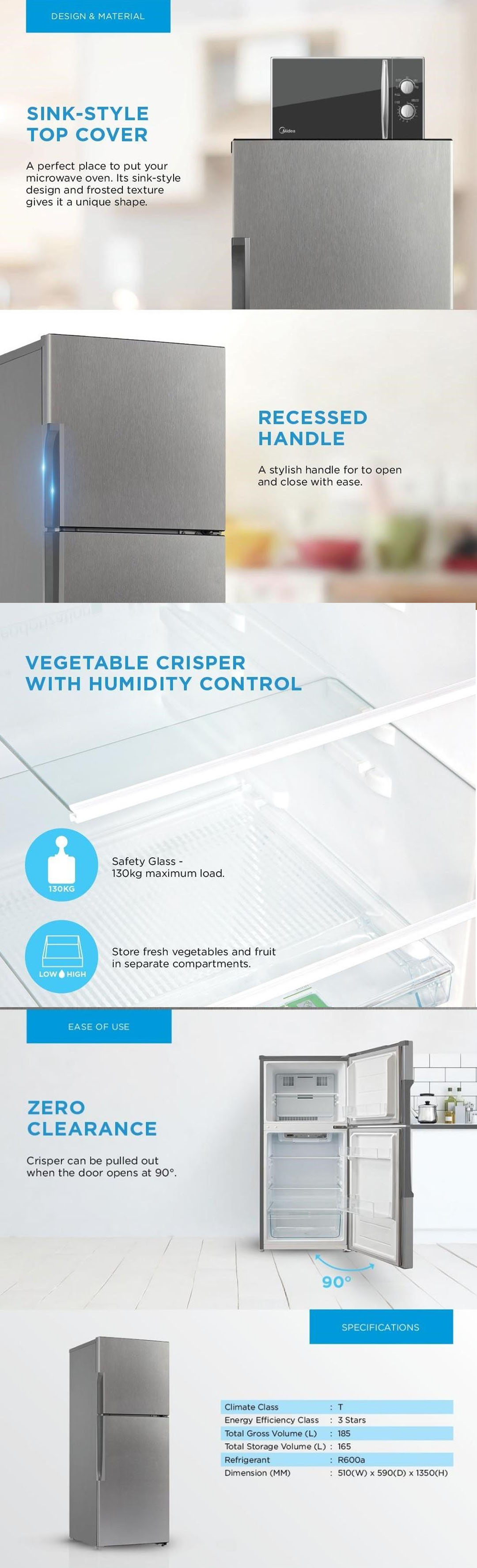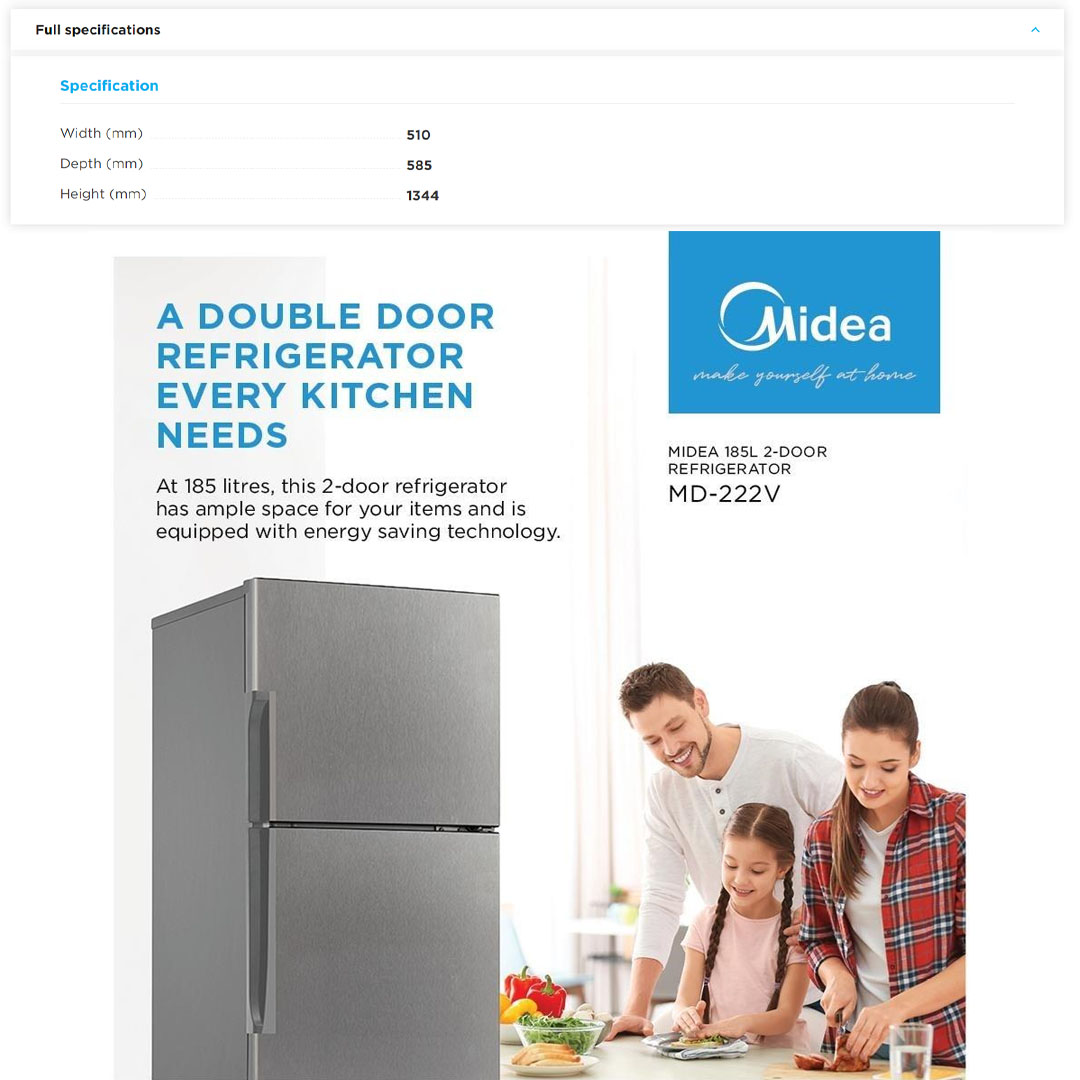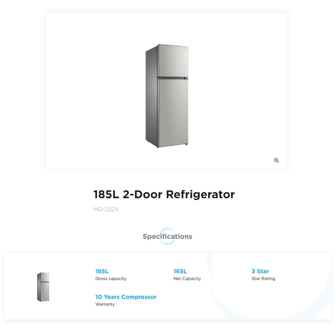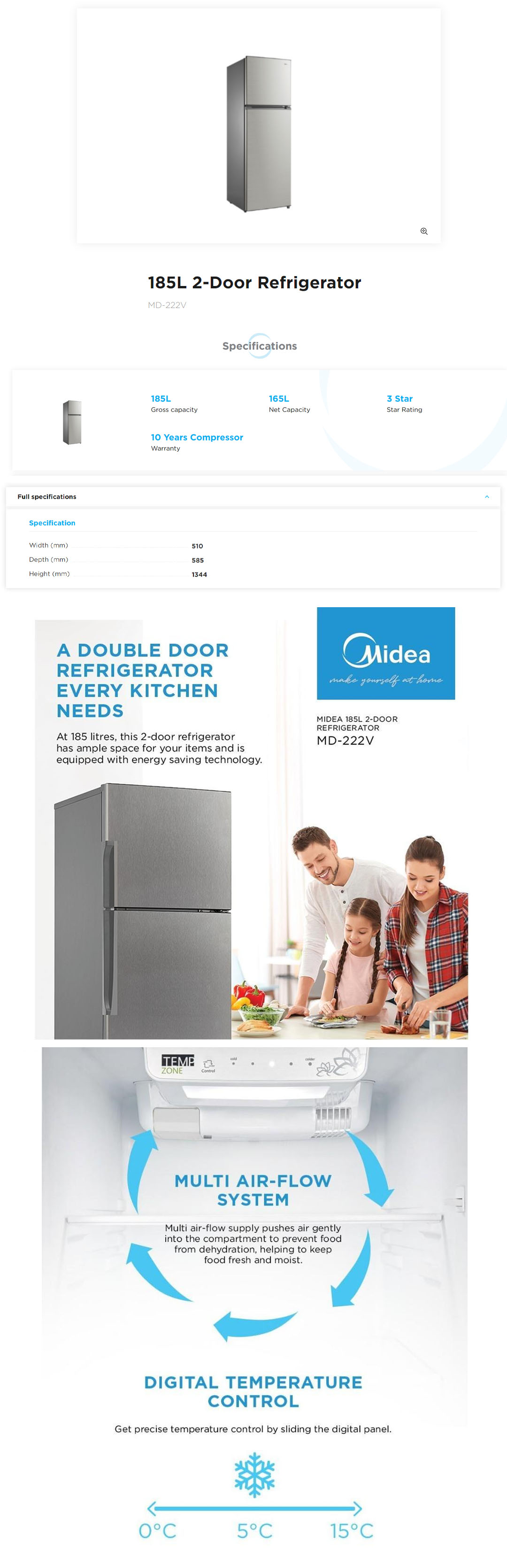 Midea 185L 2 Doors Refrigerator MD-222V | Frost Free | Interior LED Light | Multi Air Flow System | Detachable Ice Maker | Bottle Rack | Refrigerator with 1 Year Warranty