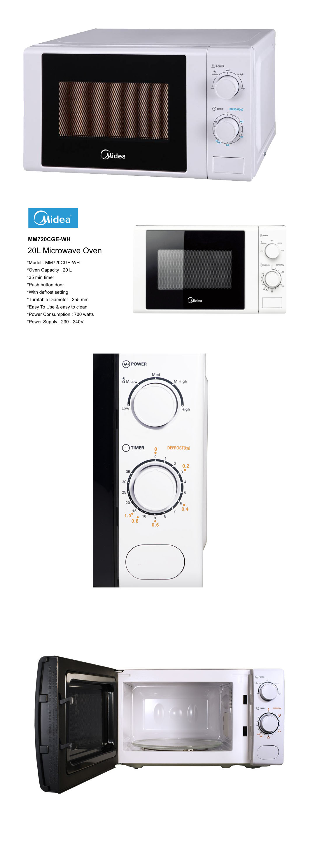 Midea 20L Microwave Oven MM720CGE-WH | Push Button Door | 5 Power Level | Defrost Setting | 35mins Timer | Output Power : 650 - 700W | Microwave with 1 Year Warranty
