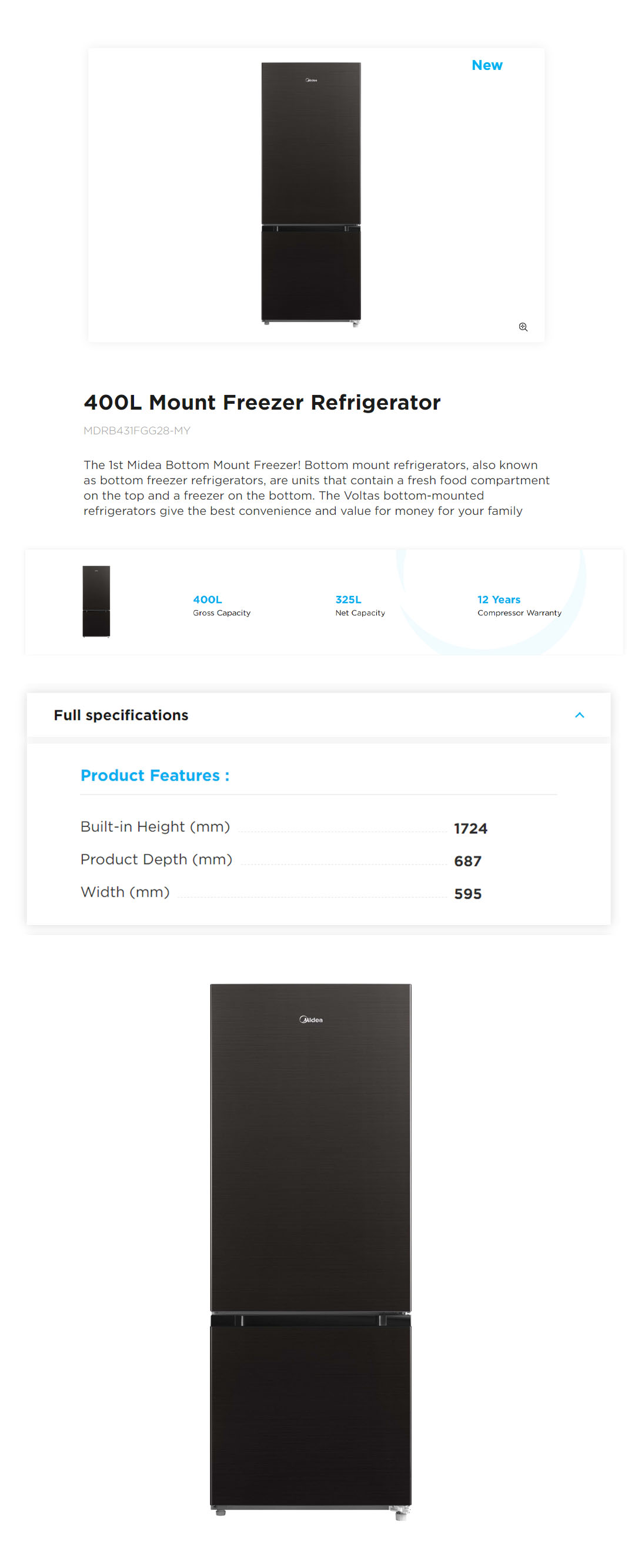 Midea 400L 2 Doors Bottom Mount Refrigerator MDRB431FGG28-MY | Flex-Zone Drawer Design | Folded Shelf | Refrigerators with 1 Year Warranty