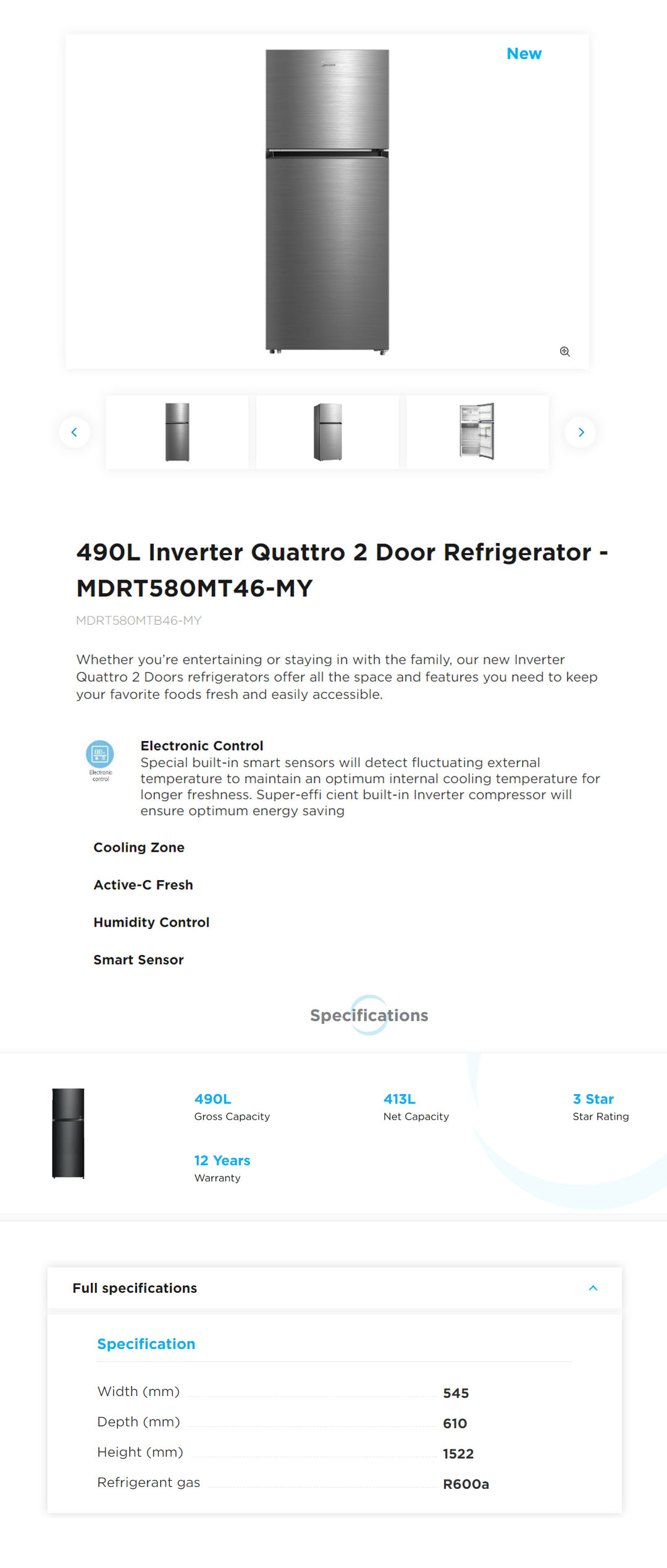 Midea 490L 2 Doors Inverter Top Mount Refrigerator MDRT580MTB46-MY | Inverter Quattro | Active-C Fresh | Big Cooling Zone | Big Ice Tray | Smart Sensor | Electronic Control | Highlight LED | Refrigerators with 1 Year Warranty