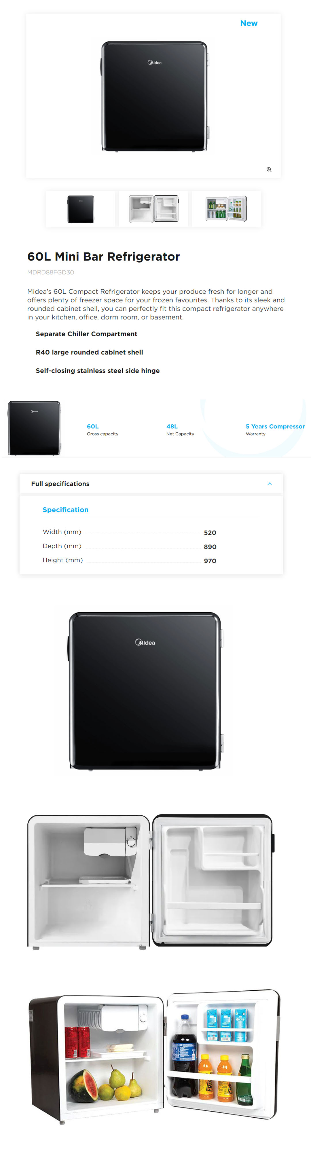 Midea 60L Mini Bar Refrigerator MDRD88FGD30 | Separate Chiller Compartment | R40 Large Rounded Cabinet Shell | Self-Closing Stainless Steel Side Singe | Refrigerator with 1 Year Warranty
