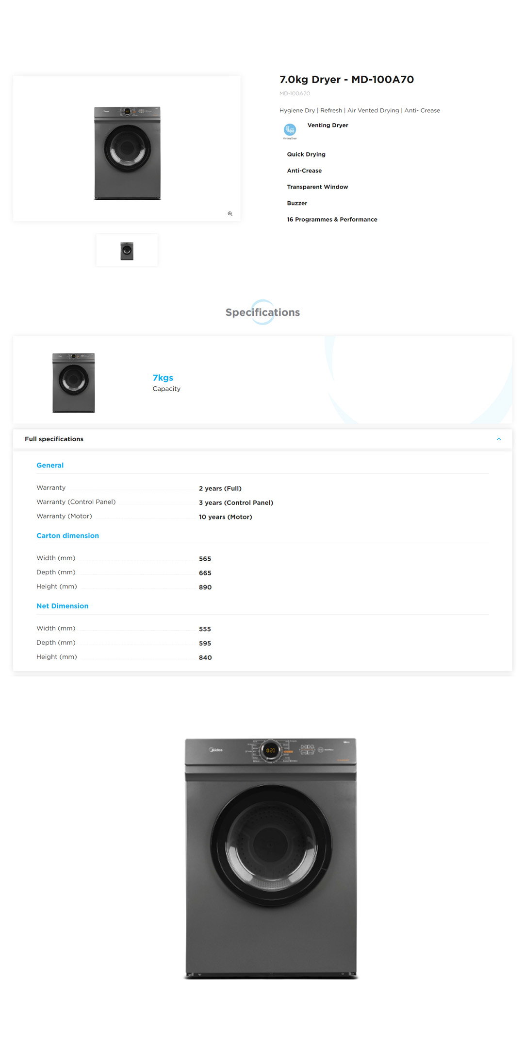 Midea 7KG Air Vented Dryer MD-100A70 | Buzzer | Electronic Control | Button program selection | Dryer with 2 Years Warranty