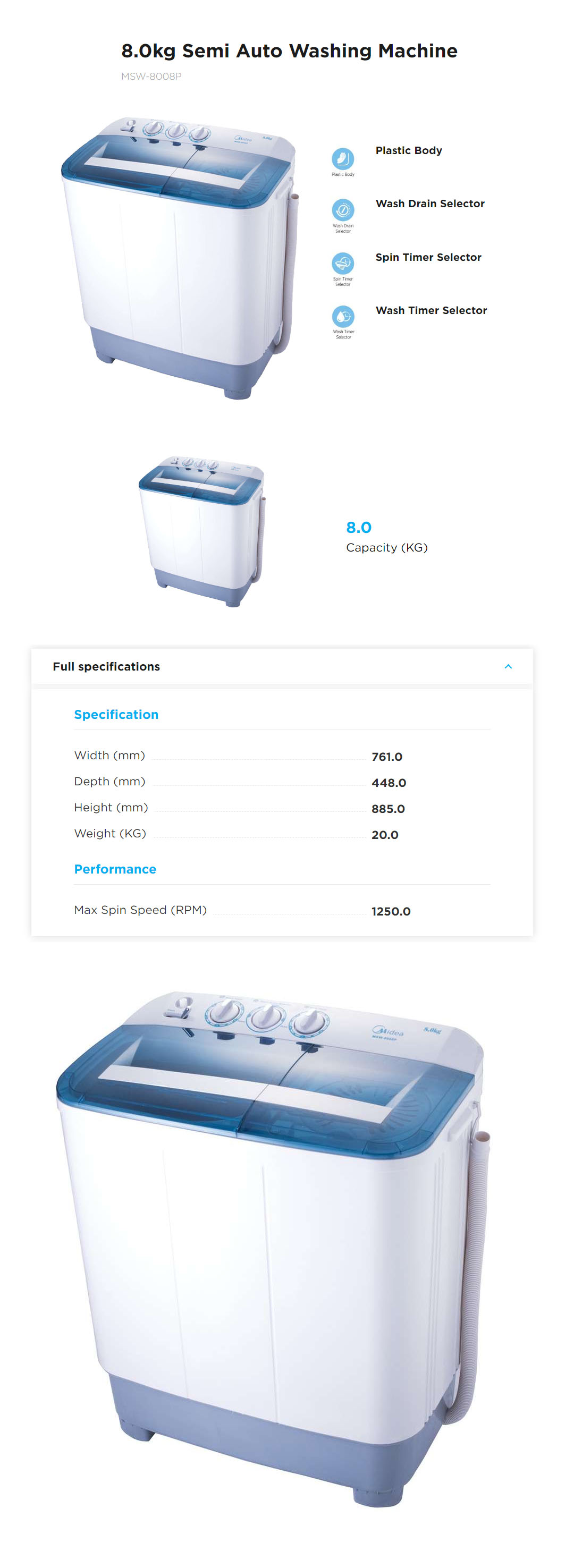 Midea 8KG Semi-Auto Washing Machine MSW-8008P | Wash Drain Selector | Wash Timer Selector | Spin Timer Selector | Fibre Body | Washing Machine with 1 Year Warranty