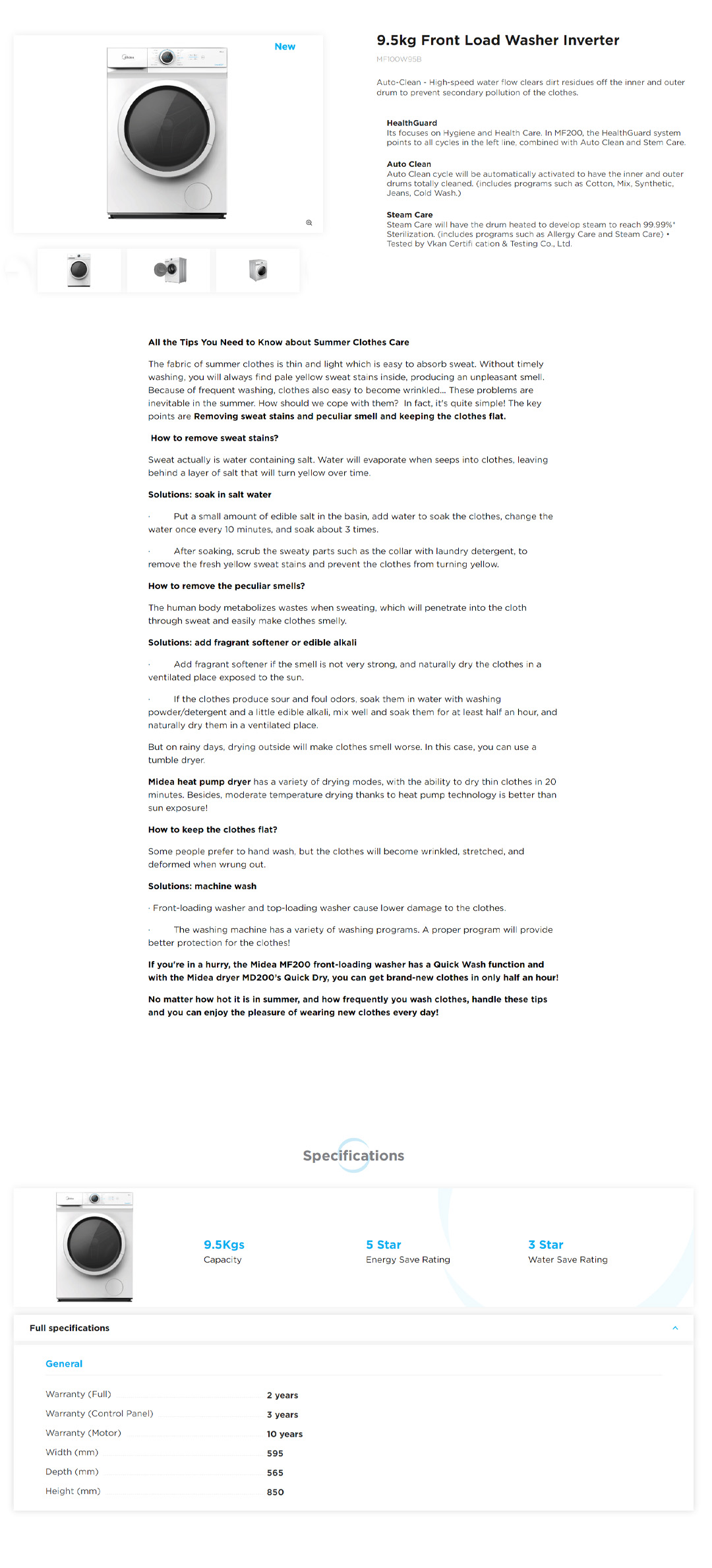 Midea 9.5KG Front Load Inverter Washing Machine MF100W95B | One Touch Pre-Wash | Broad Vision Port | Inverter Motor | Washing Machine with 2 Years Warranty
