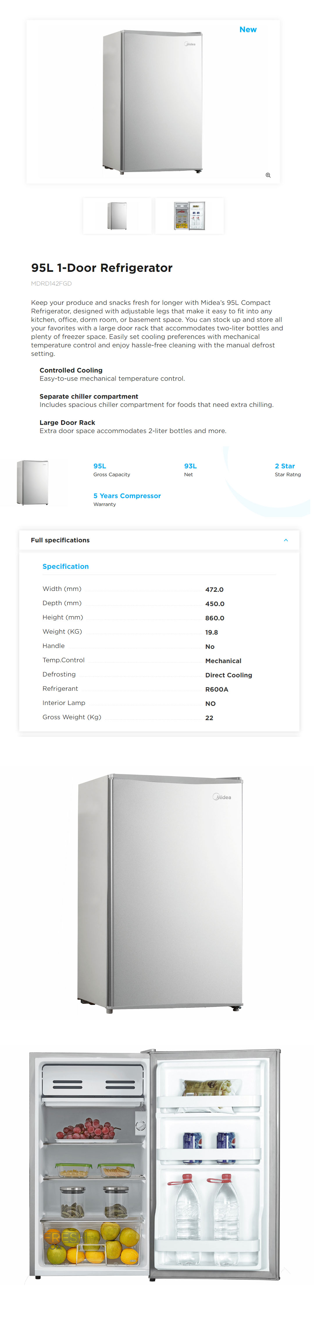 Midea 96L Single Door Refrigerator MDRD142FGD | Reversible Door | Adjustable Leg | Energy Saving | Mechanical Temperature Control | Separate Chiller Compartment | Refrigerator with 1 Year Warranty