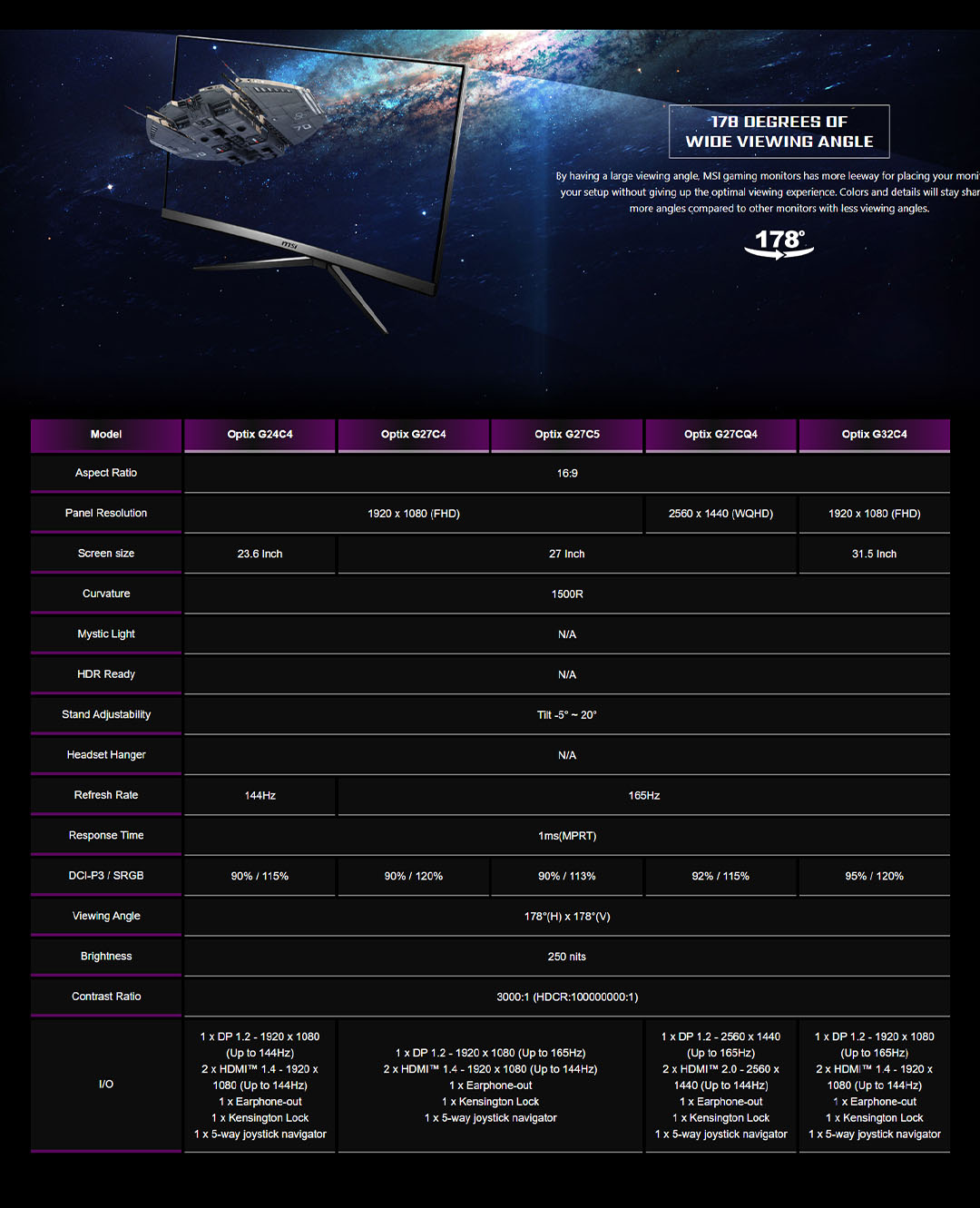 MSI Optix Curved Gaming Monitor G32C4X 31.5-inch | 250hz Refresh rate | 178 degrees of wide viewing angle | HDR technology | with 3 Years Warranty