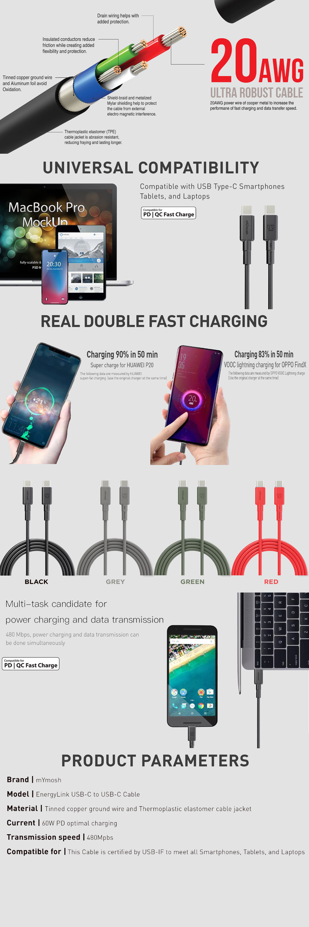 mYmosh 1.2m Lightning To USB Cable | USB-IF Certification | Support Fast Charge And SuperCharge | Tinned Copper Ground Wire | Thermoplastic Elastmer (TPE) | Cable with 2 Year Warranty