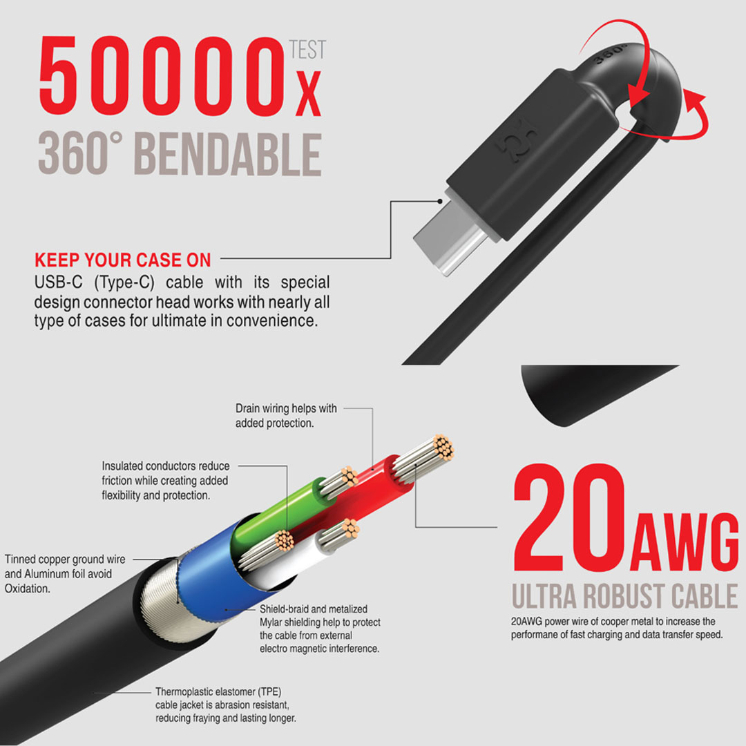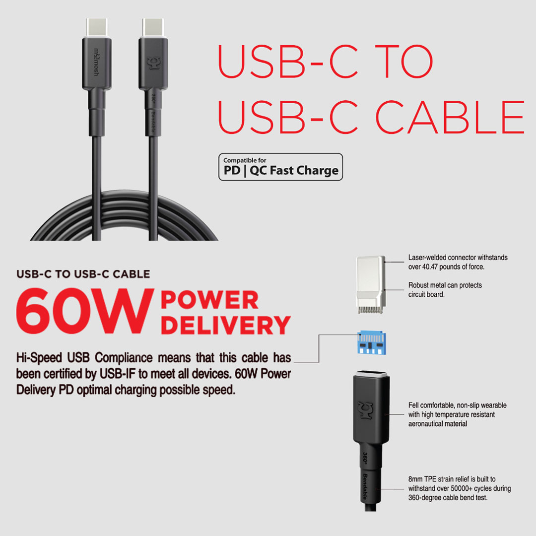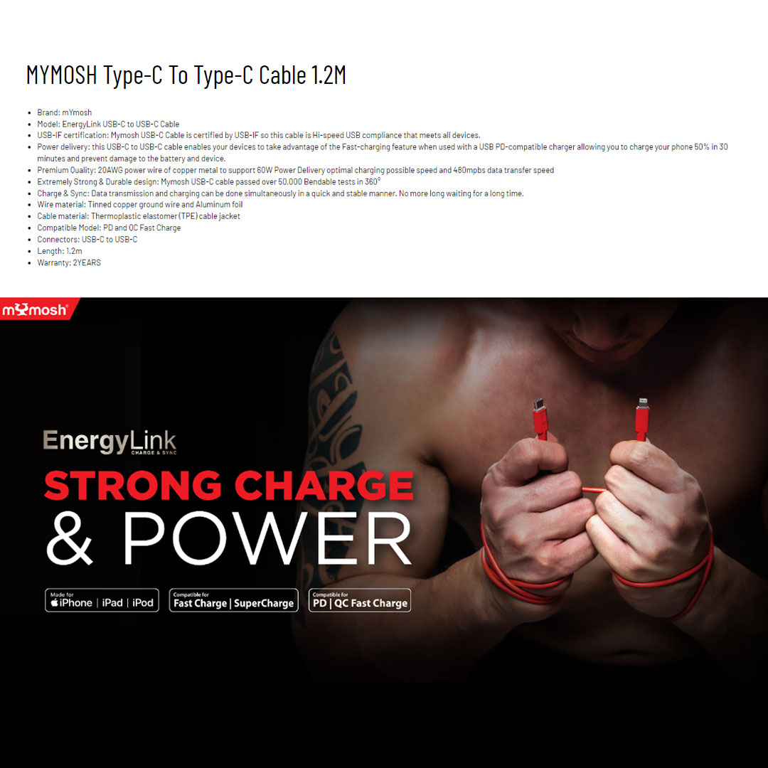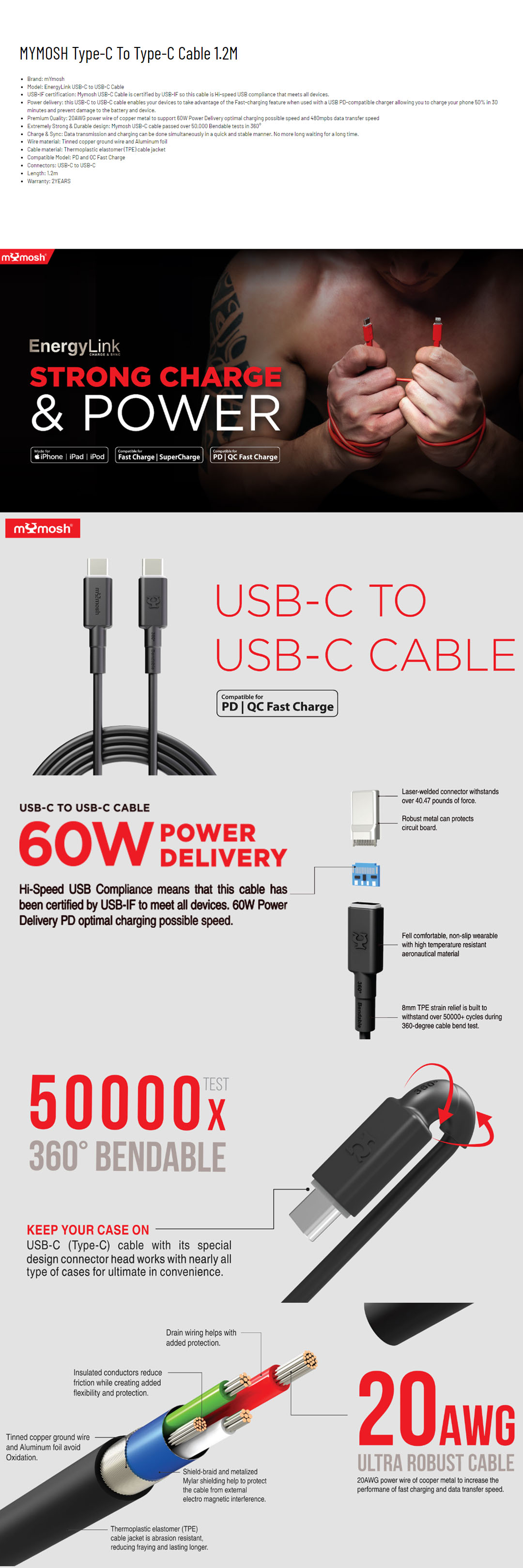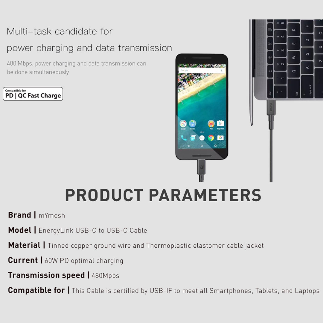mYmosh 1.2m USB-C To USB-C Cable | USB-IF Certification | Support Fast Charge And SuperCharge | Tinned Copper Ground Wire | Thermoplastic Elastmer (TPE) | Cable with 2 Year Warranty