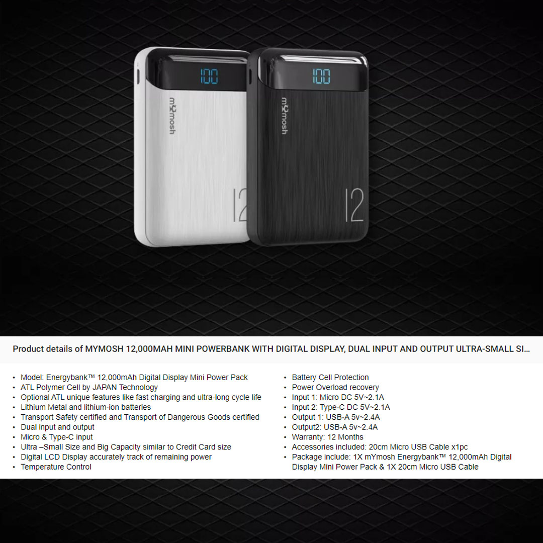 mYmosh 12000mAh Digital Display Mini Power Pack | Battery Cell Protection | Dual Input and Output | Digital LCD Display | Temperature Control | Transport Safety Certified | Powerbank with 1 Year Warranty