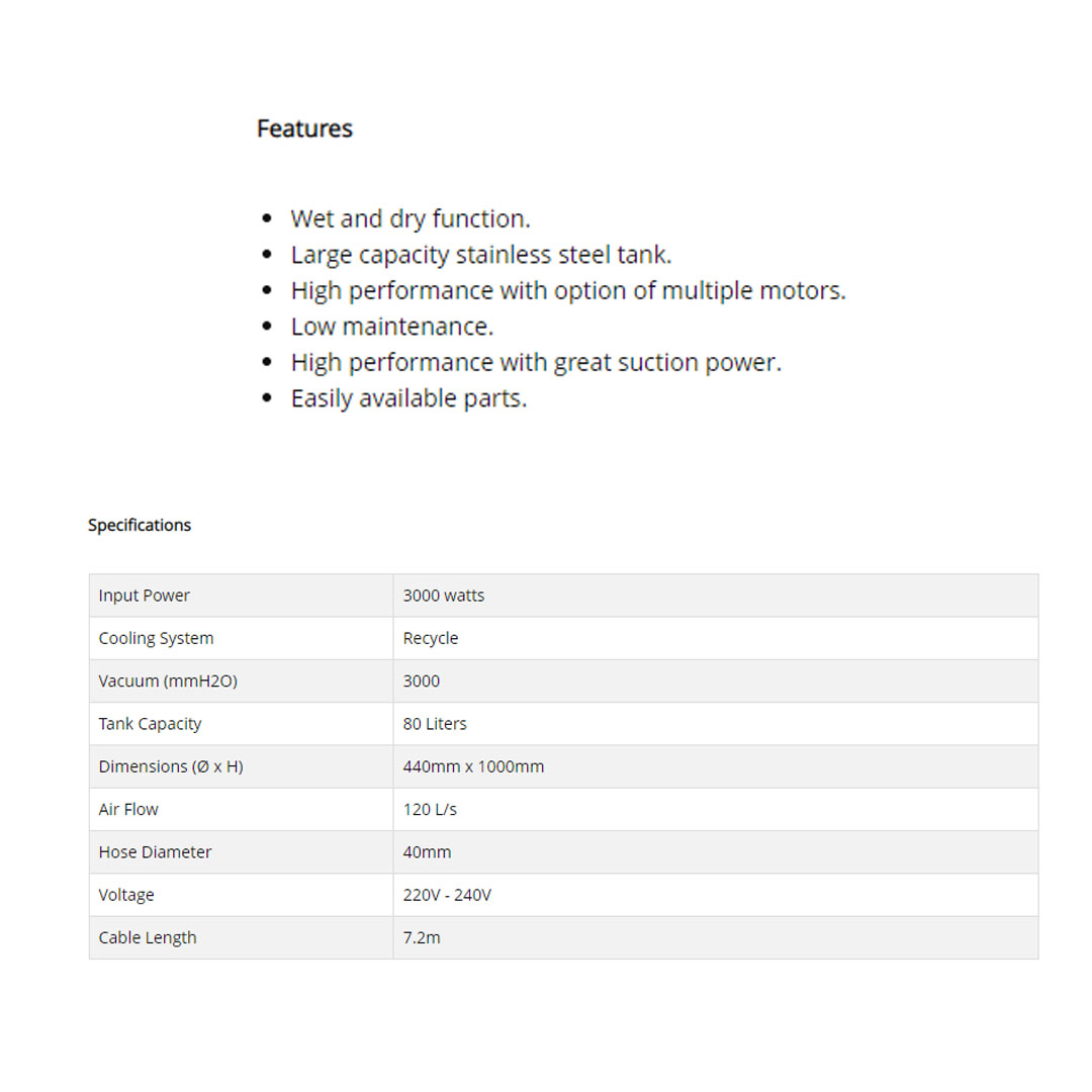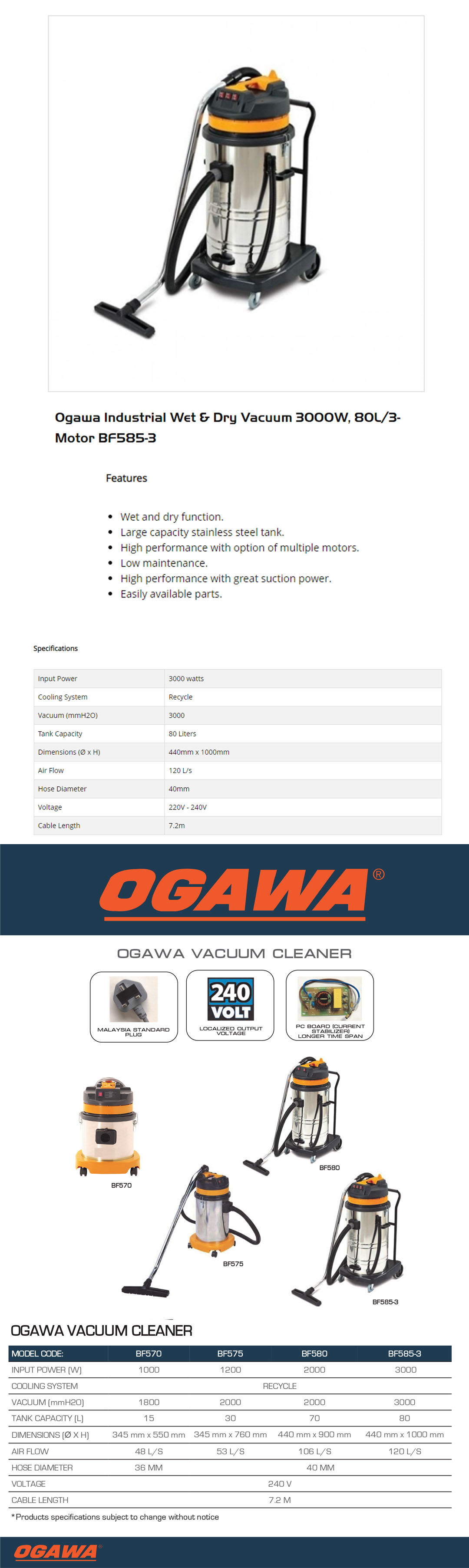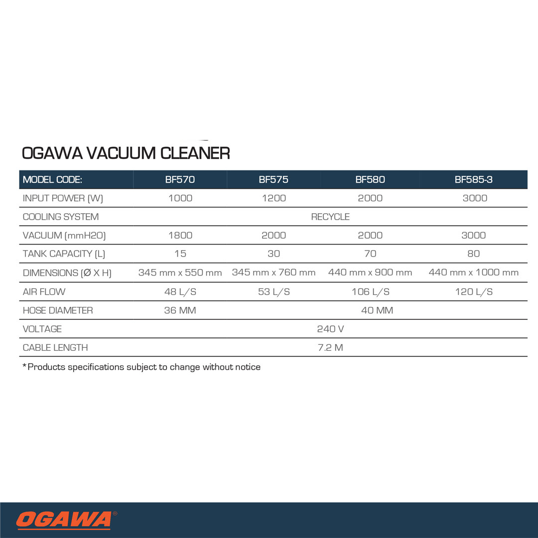 Ogawa 3000W Industrial Wet & Dry Vacuum Cleaner BF585-3 | 80Liter | Round Stainless Steel Tank | Silent Motor | Wet and Dry Function | Vacuum Cleaner with 6 Months Warranty