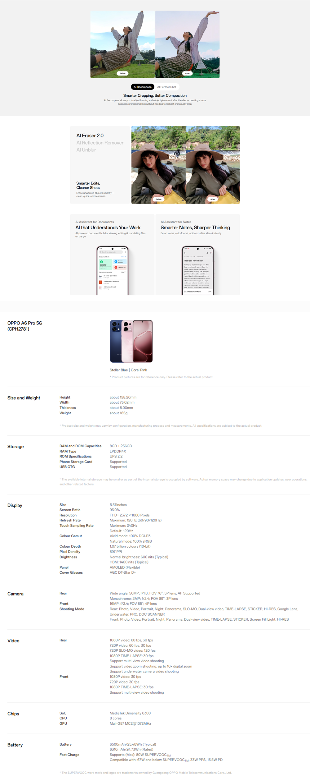 OPPO A6 Pro 5G 8GB+256GB | 50MP Camera | 6.57 inch, AMOLED | Li-Po 6500mAh | Mediatek Dimensity 6300 (6 nm) | Android 15, ColorOS 15