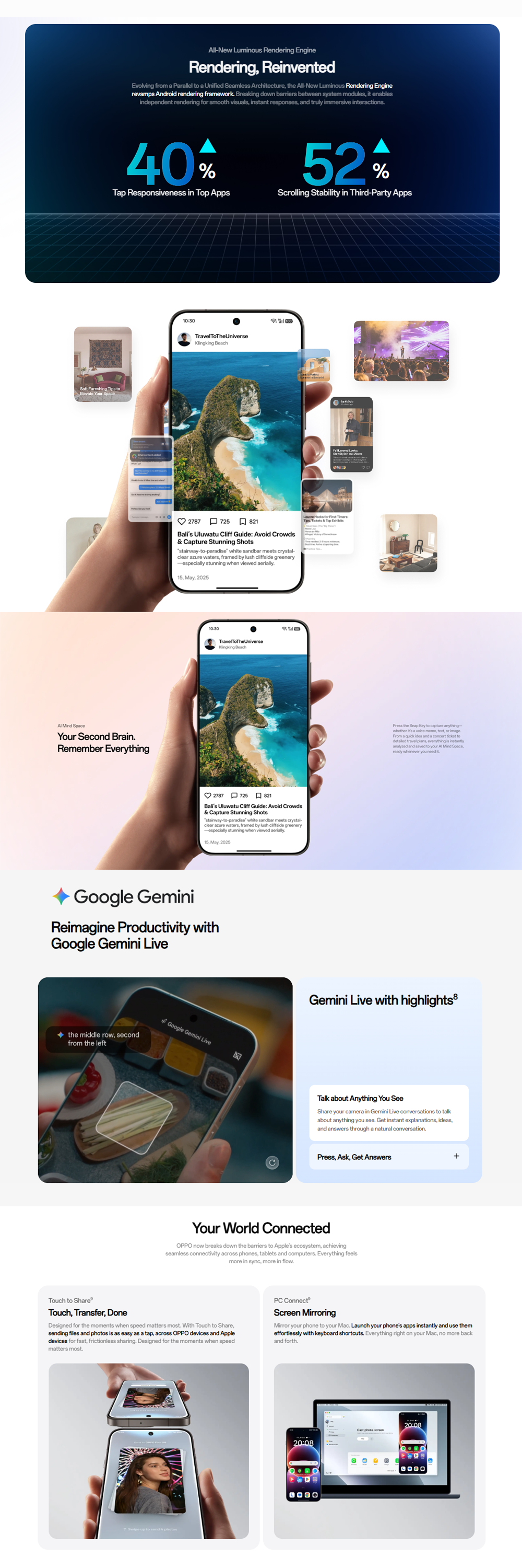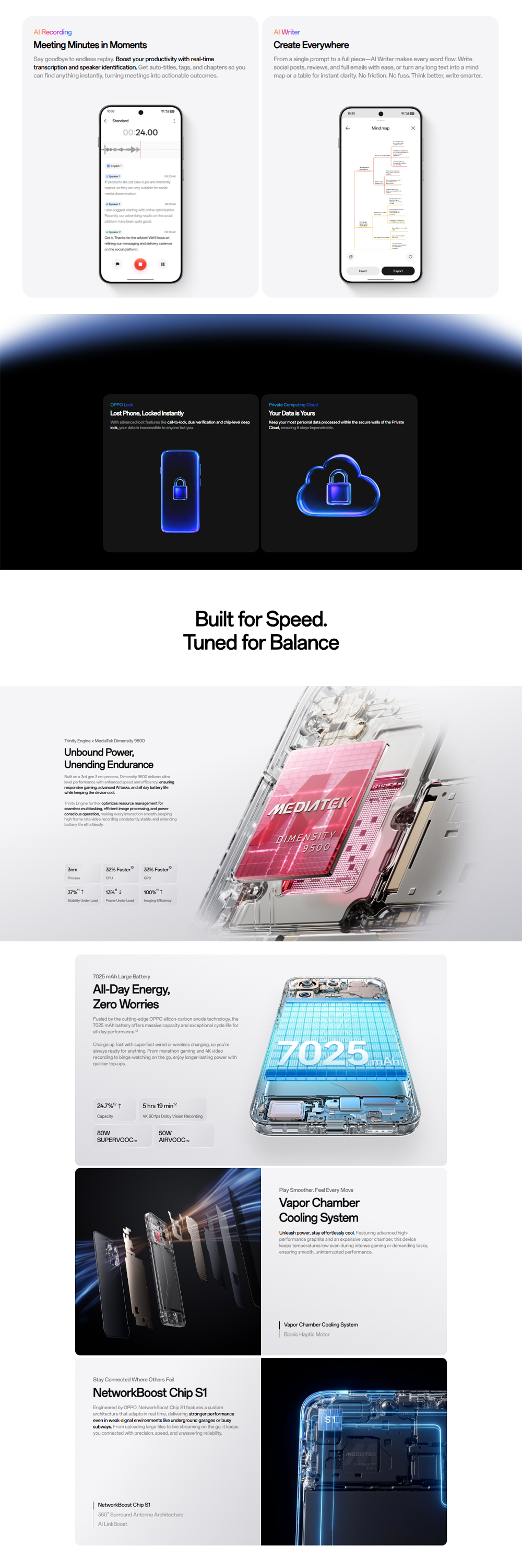 • Brand : OPPO • RAM(GB) : 16GB • Internal Memory(GB) : 512GB • Operating System : Android 16, ColorOS 16 • Processor Type : Mediatek Dimensity 9500 (3 nm) • Screen Size(inch): 6.59inch, AMOLED, 1B colors, 120Hz • Camera Front(MP): 32MP • Camera Back(MP): 50MP+50MP+50MP • Sim Slots: Dual SIM • Resolution: 1256 x 2760, 460 ppi density • Networks: LTE,5G • Battery Capacity(mAh): 7025mAh, Fast Charg