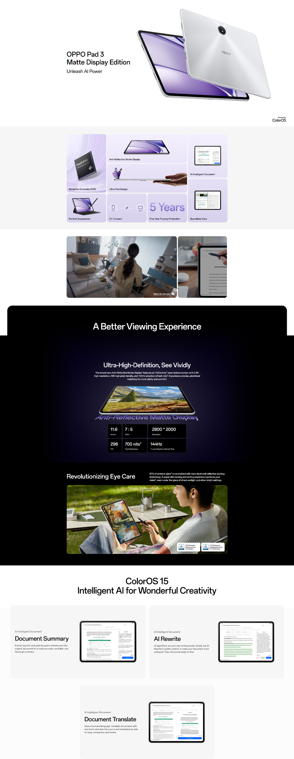 OPPO Pad 3 Matte Display Edition | Mediatek Dimensity 8350 | Ultra Thin Design | Five Year Fluency Protection