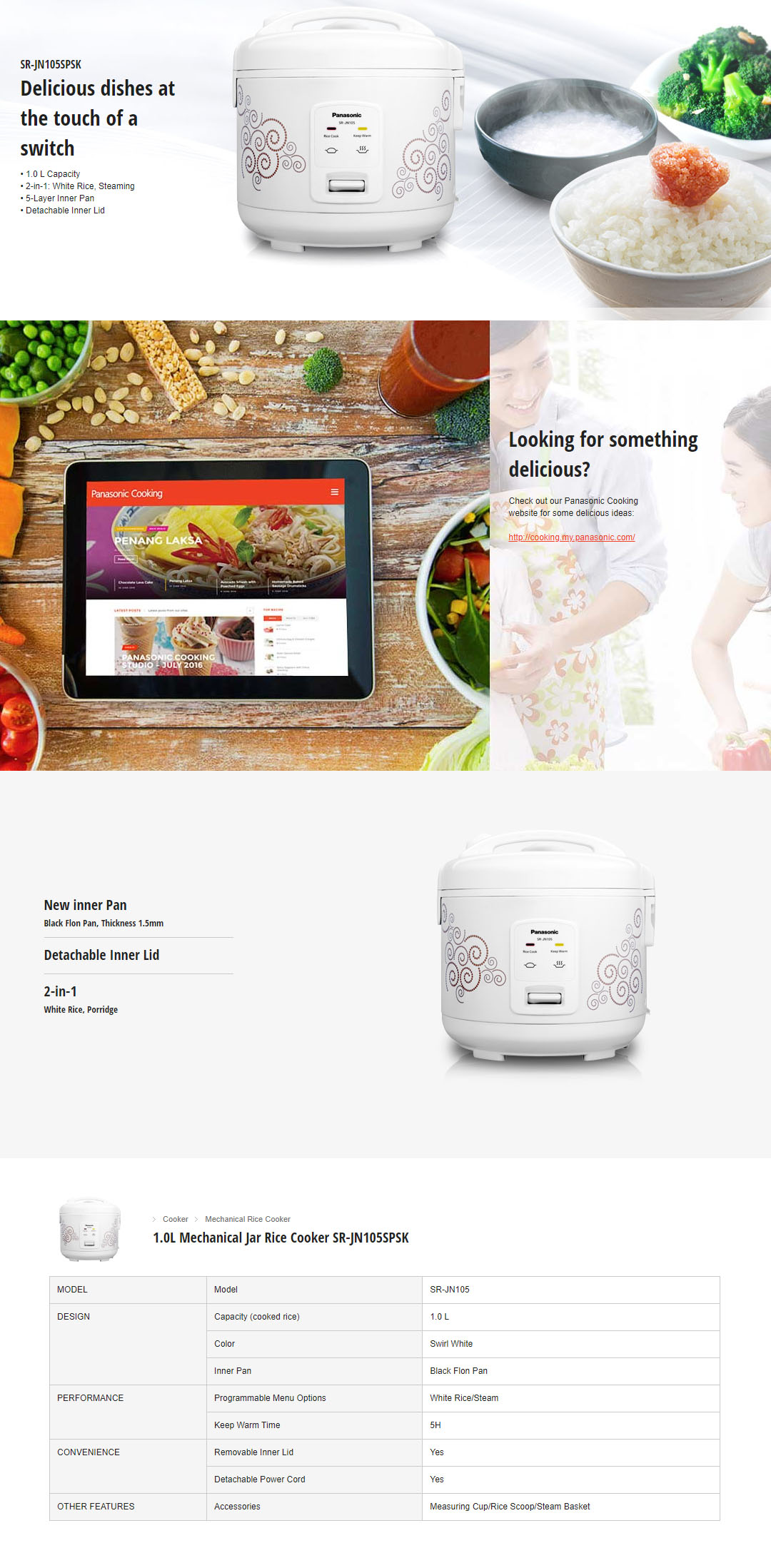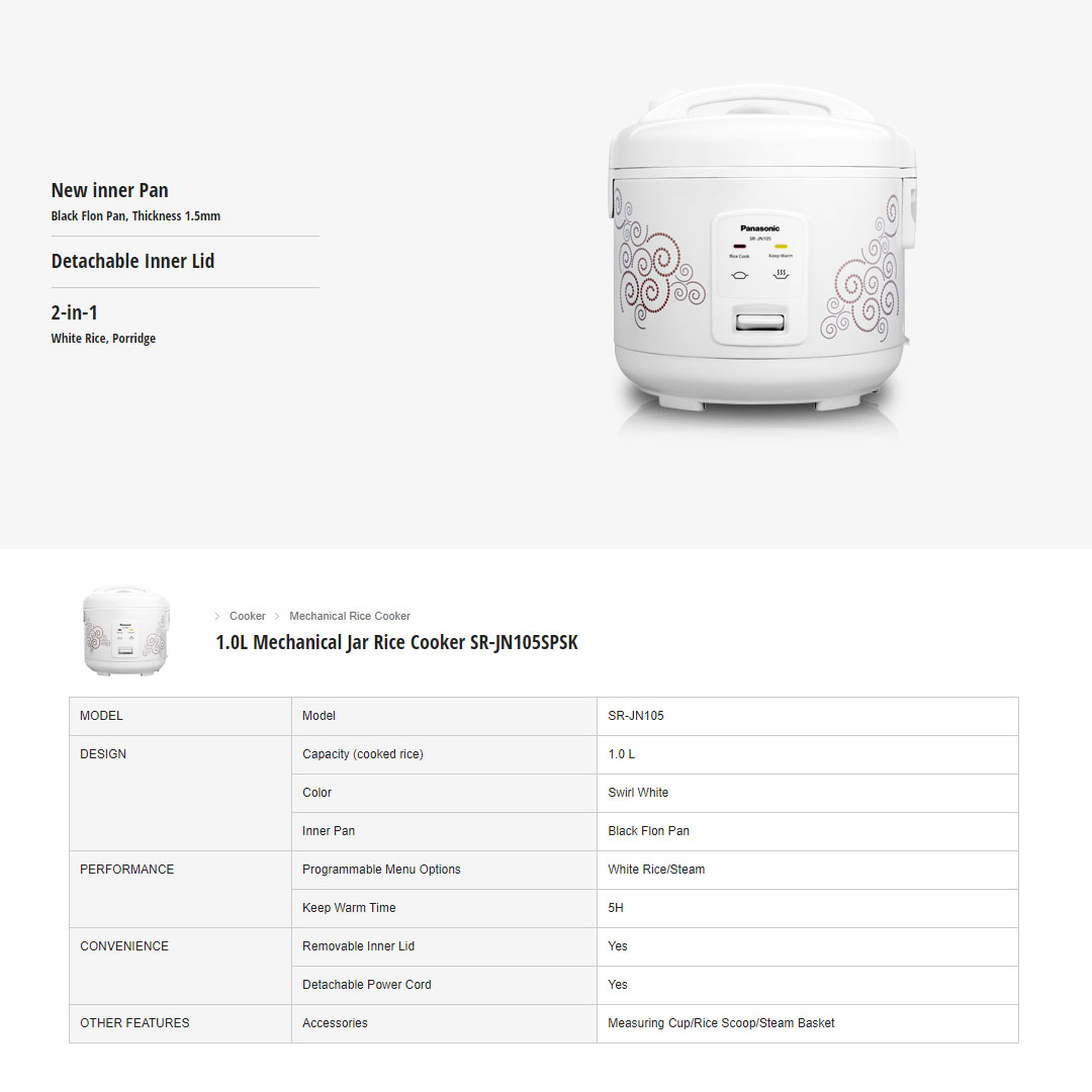 Panasonic 1.0L Mechanical Jar Rice Cooker SR-JN105SPSK | 5-Layer Inner Pan | Thickness 1.5mm | 2-in-1 | Rice Cookers with 1 Year Warranty