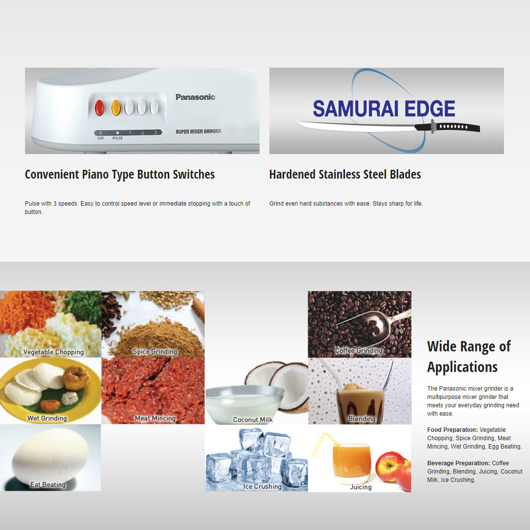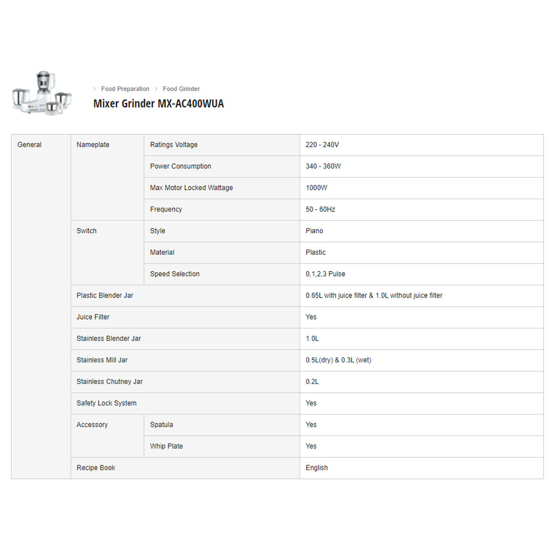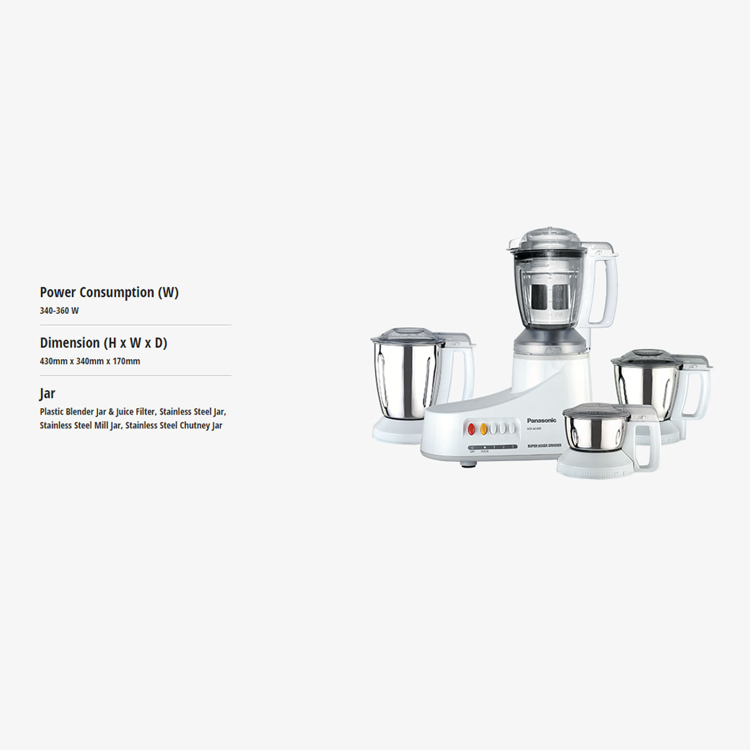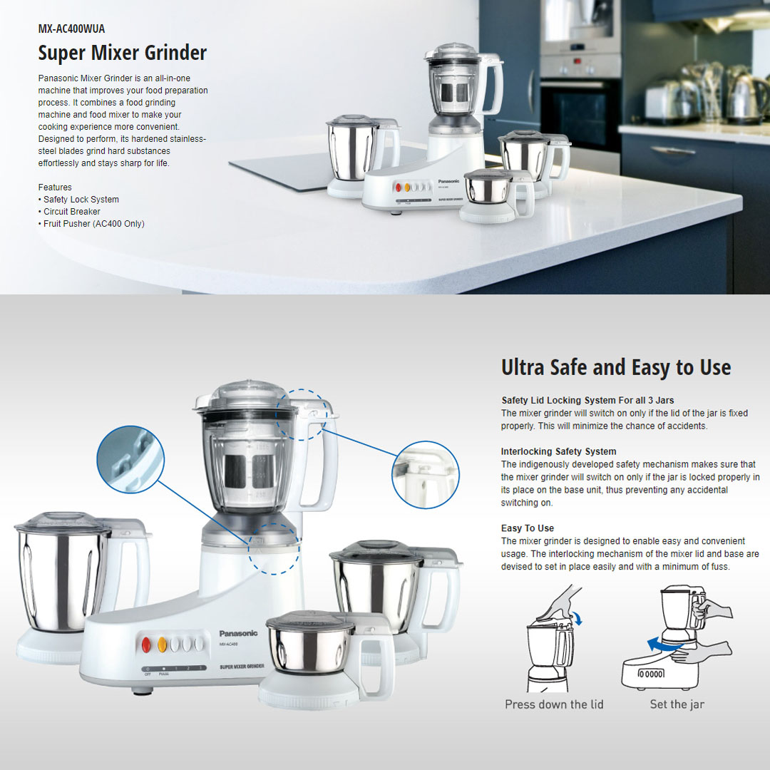 Panasonic 1.0L Mixer Grinder MX-AC400WUA | Ultra Safe | Easy to Use | Food Pusher | Grinder with 1 Year Warranty