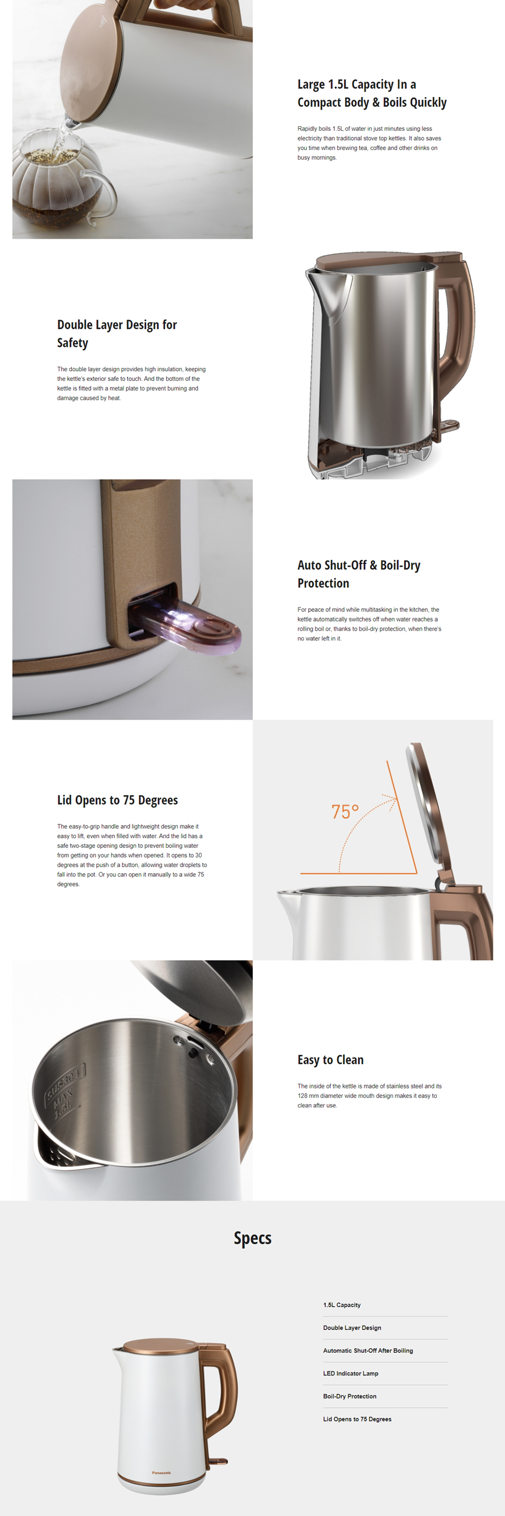 Panasonic 1.5L Stainless Steel Electric Kettle NC-KD300WSK | Double Layer Design | LED Indicator Lamp | Boil-Dry Protection