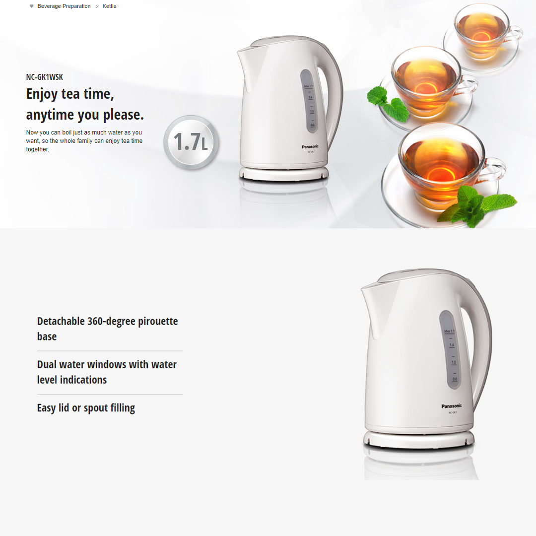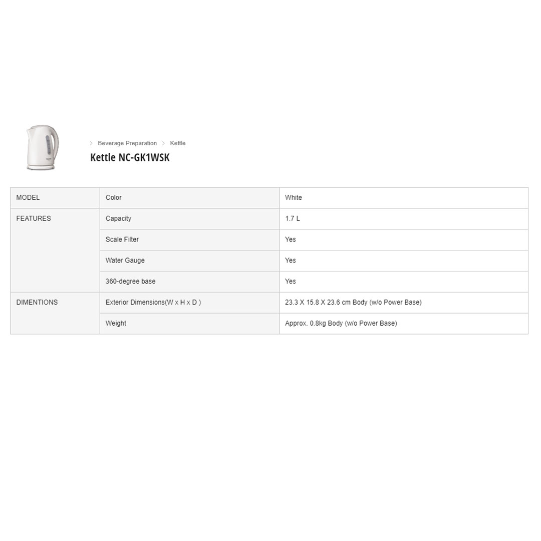 Panasonic 1.7L Kettle NC-GK1WSK | Scale Filter | Water Gauge | Easy Lid | Kettles with 1 Year Warranty