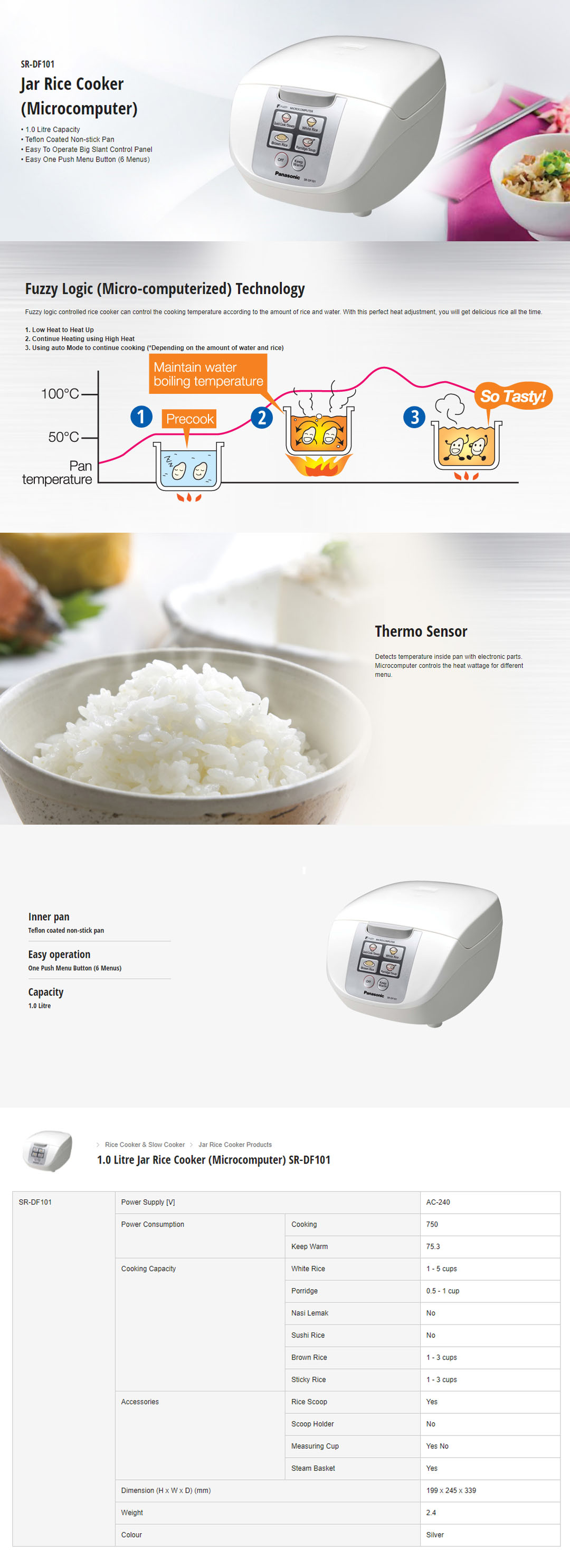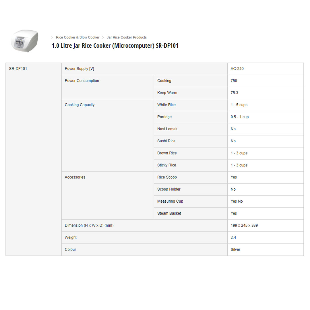 Panasonic 1.8L Jar Rice Cooker SR-DF101WSK | Teflon Coated Non-stick Pan | Thermo Sensor | Easy Operation | Rice Cookers with 1 Year Warranty
