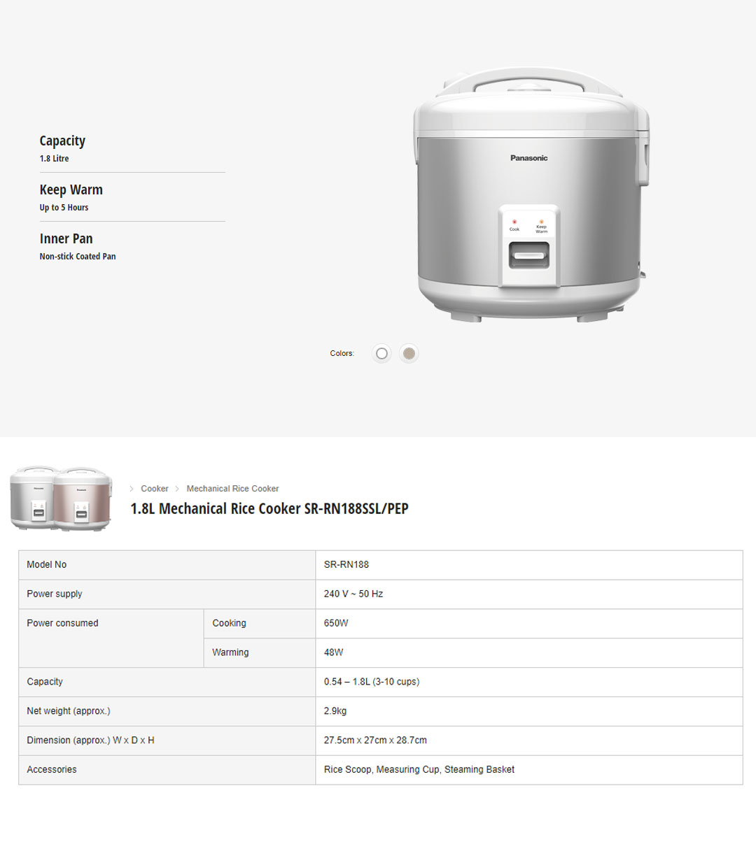 Panasonic 1.8L Mechanical Rice Cooker SR-RN188SSL | Non-stick Coated Pan | Easy to Wash | Easy Detachable | Rice Cookers with 1 Year Warranty